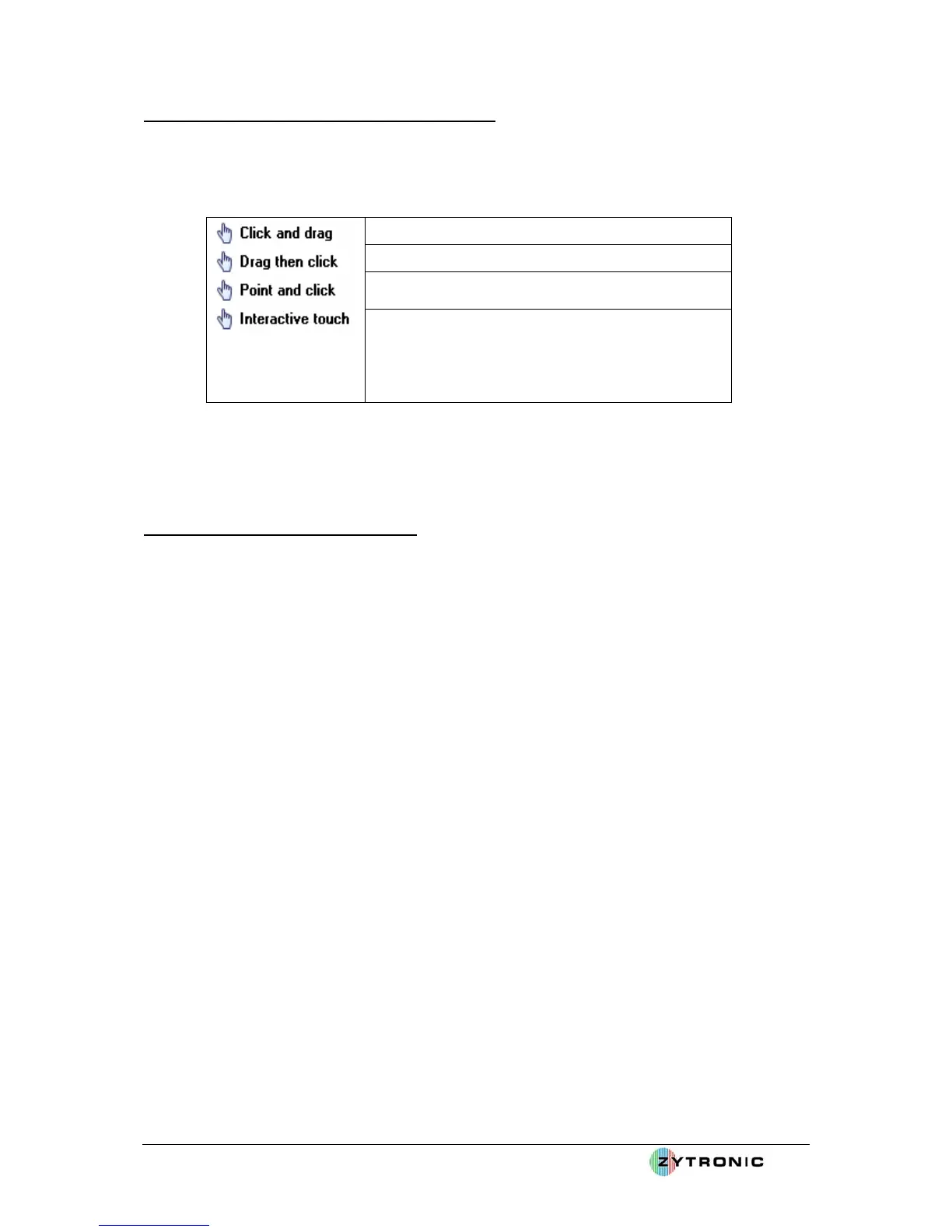 • The touchscreen can operate and emulate different mouse click modes depending of the user’s