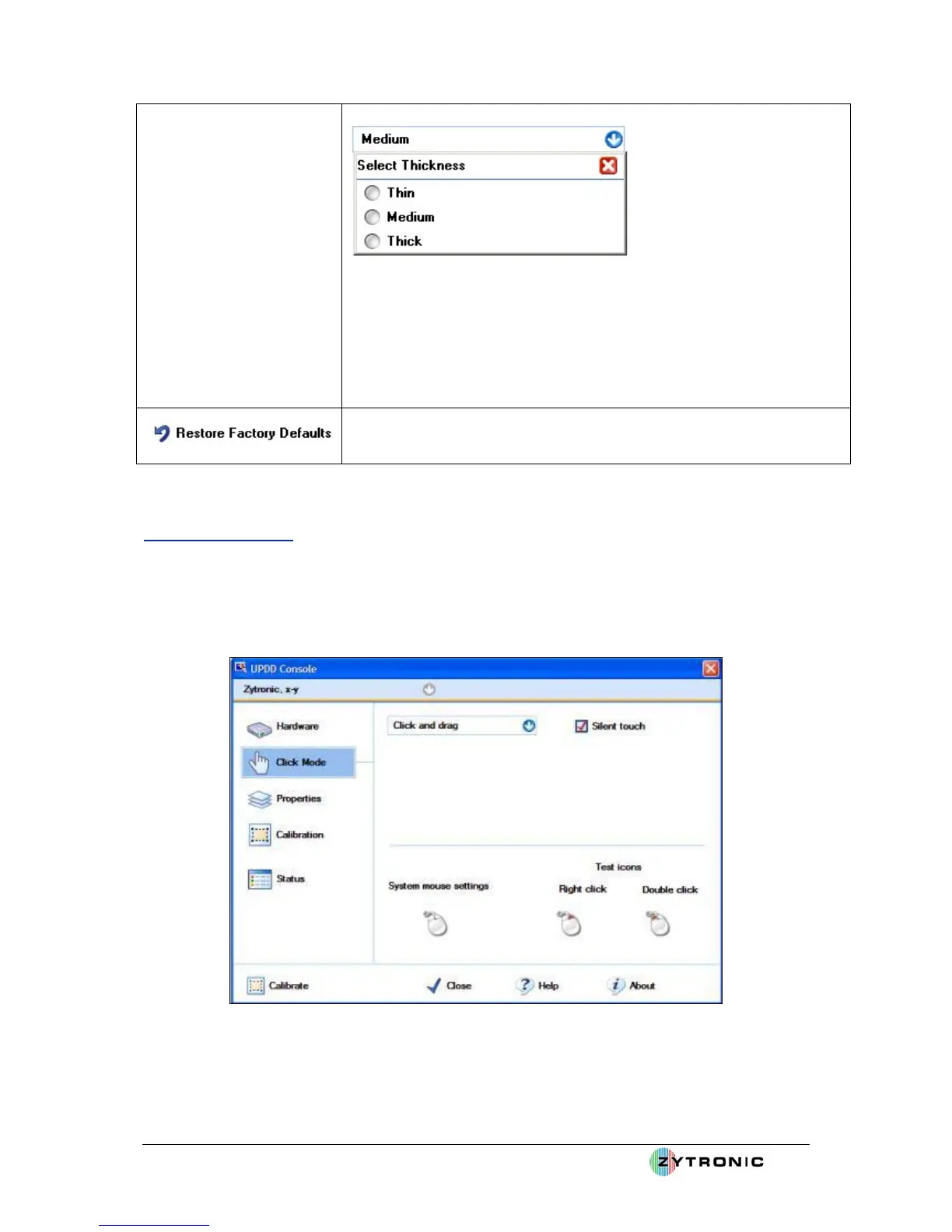 The Click Mode page defines the click mode emulation and links to the click mode settings within the