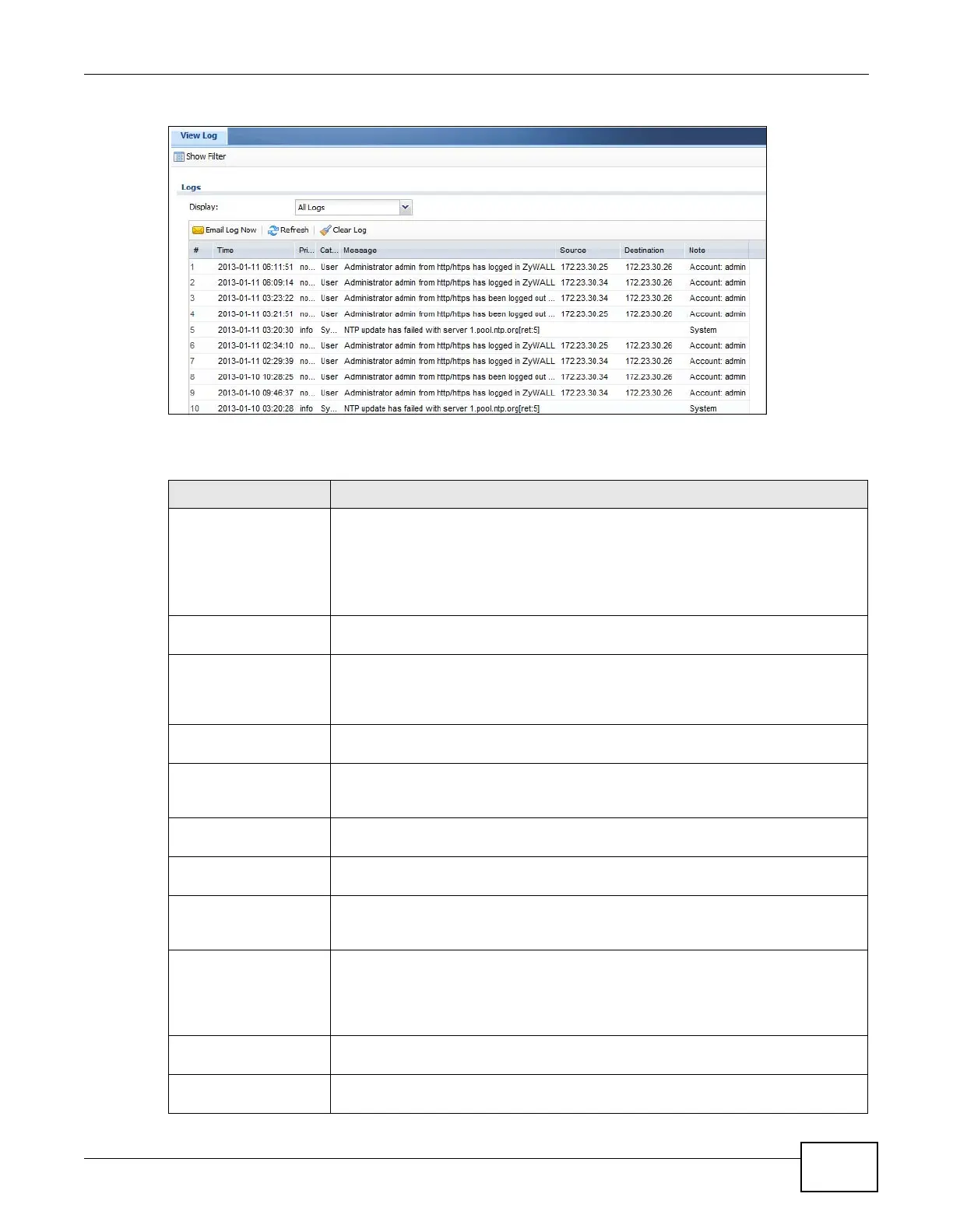 Display Select the category of log message(s) you want to view. You can also view All Logs