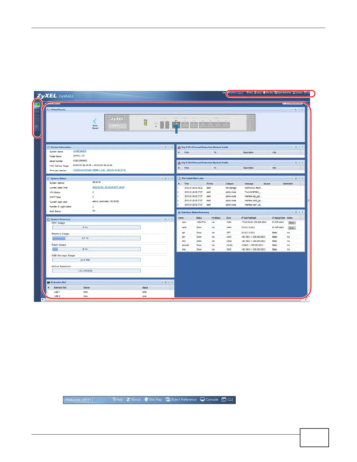 The Web Configurator screen is divided into these parts (as illustrated on page 21):