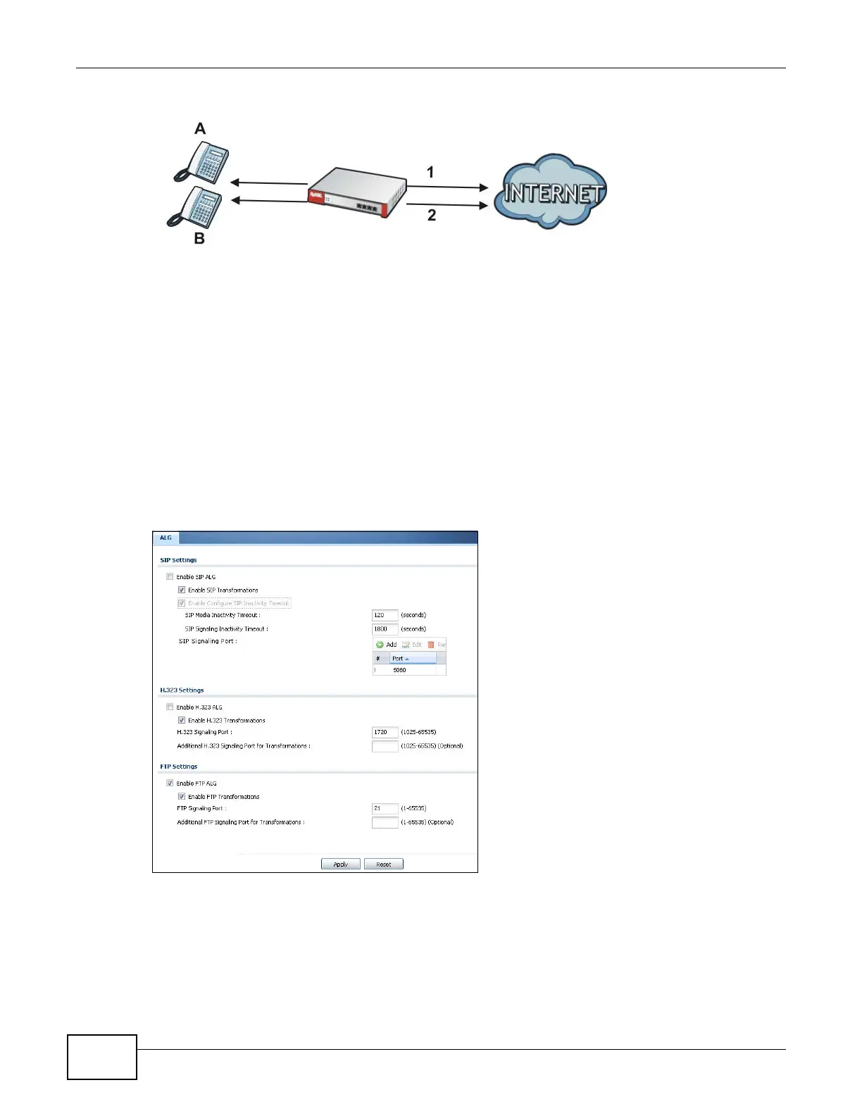 or on, configure the port numbers to which they apply, and configure SIP ALG time outs.