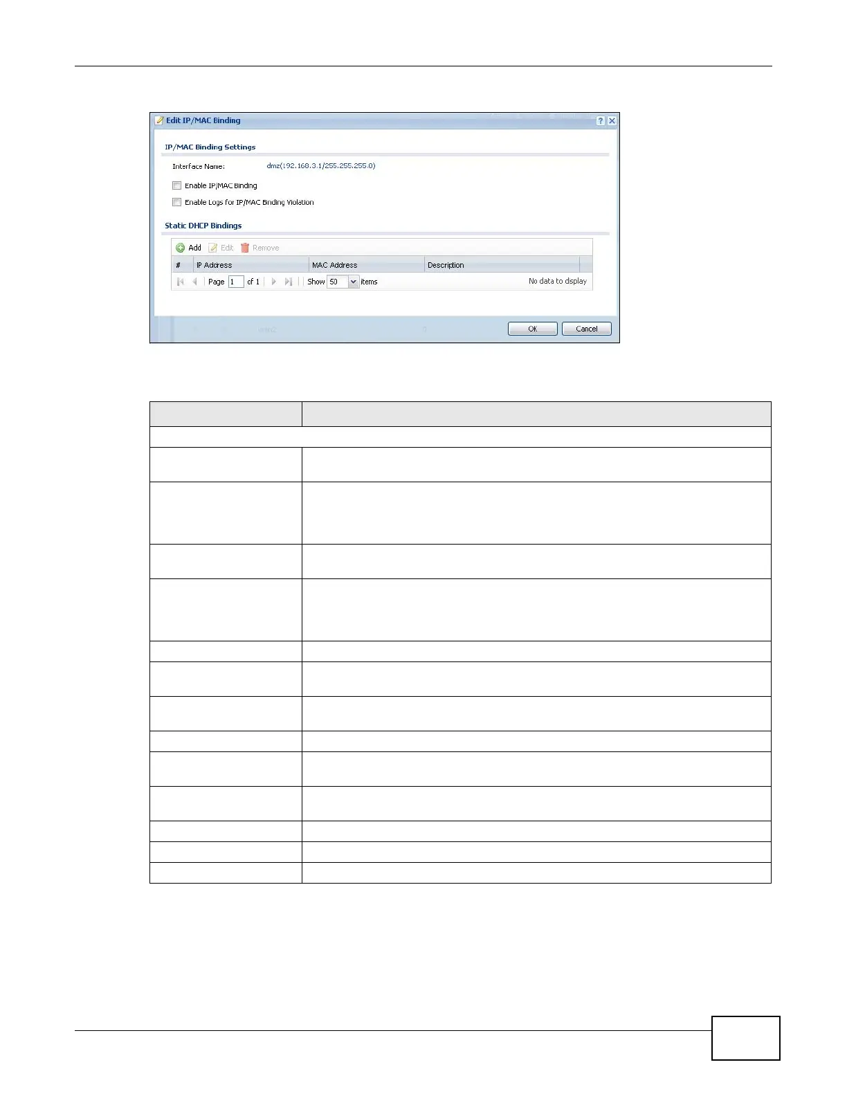 Static DHCP Bindings This table lists the bound IP and MAC addresses. The ZyWALL checks this table