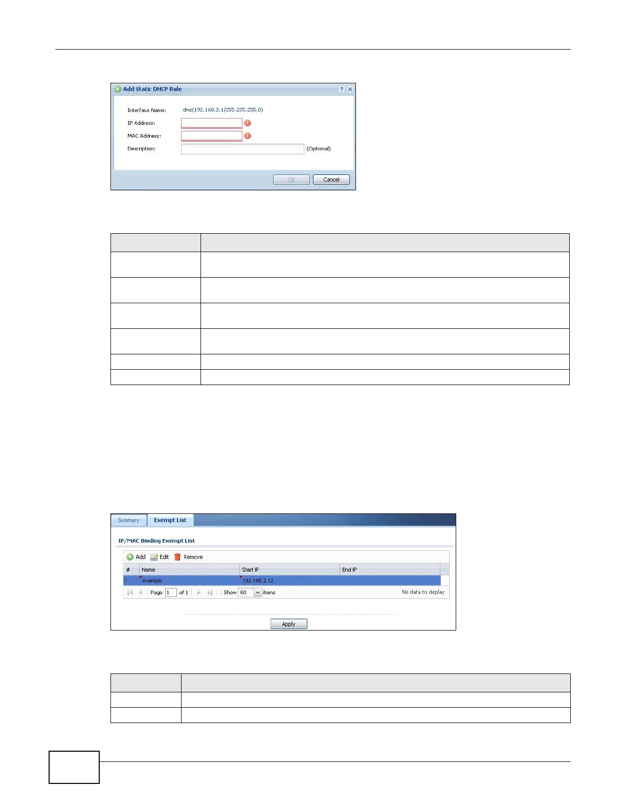 Table 91 Configuration > Network > IP/MAC Binding > Exempt List