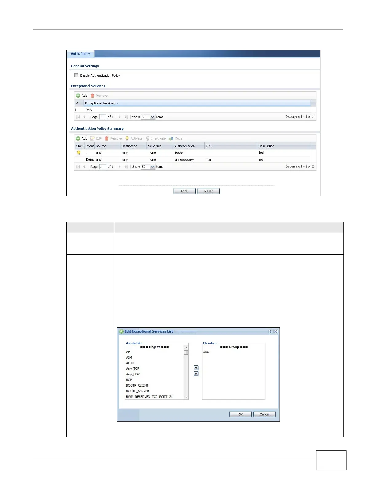 Table 95 Configuration > Auth. Policy