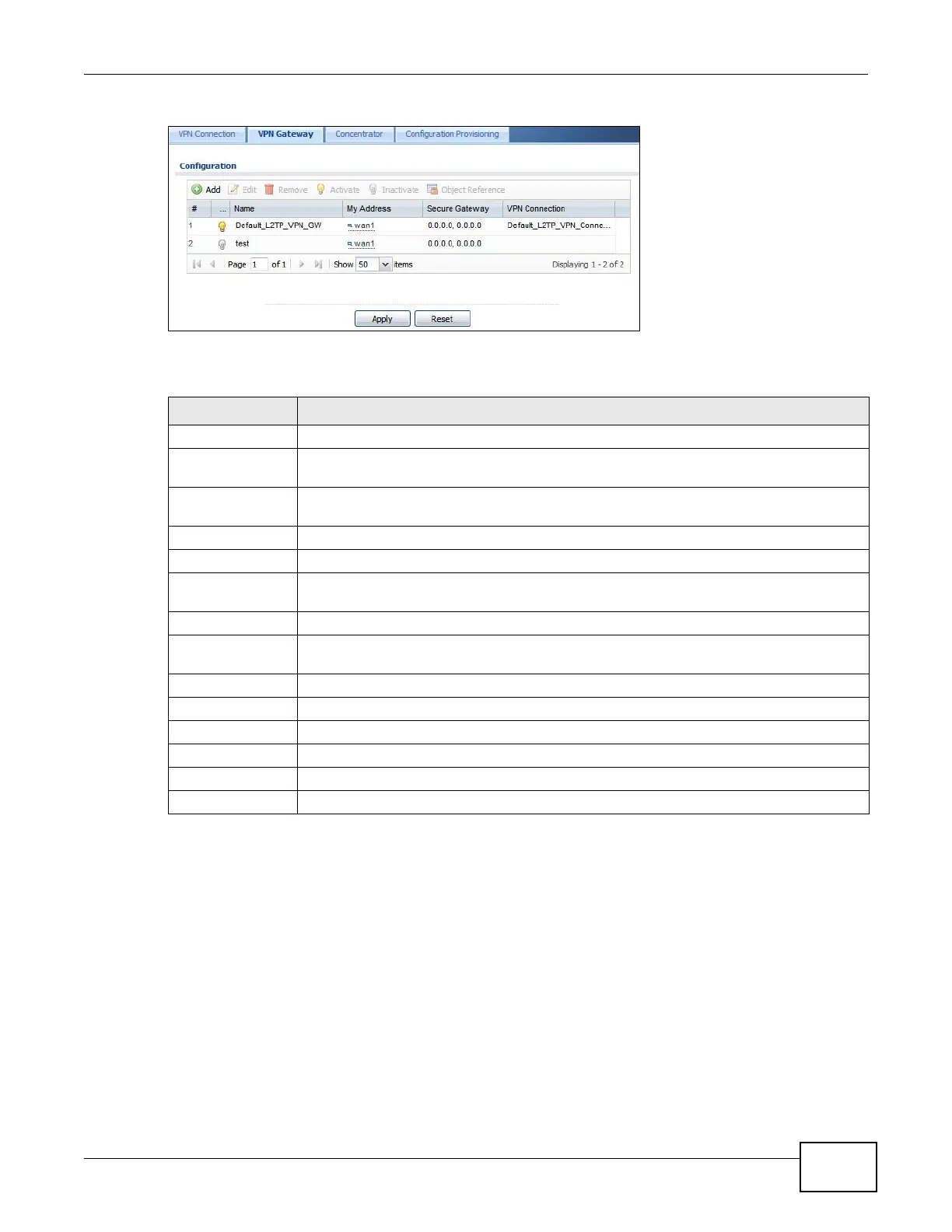 Table 109 Configuration > VPN > IPSec VPN > VPN Gateway