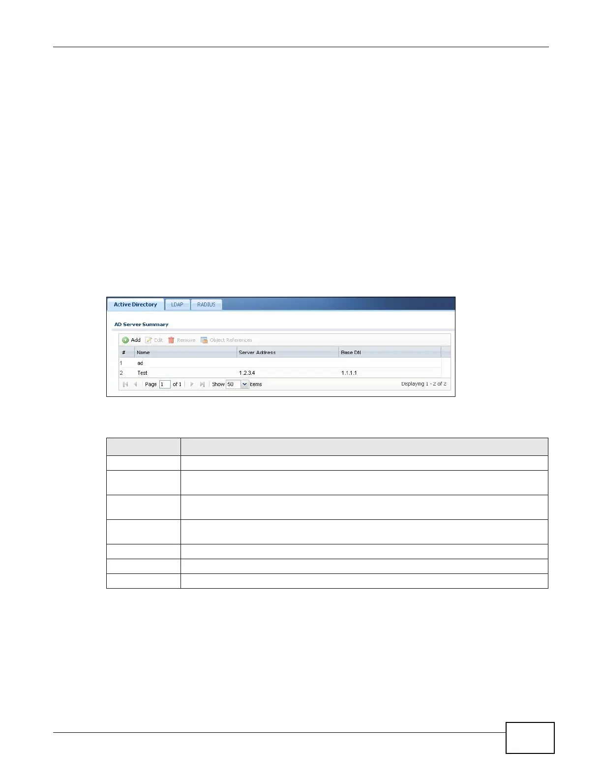 Use the Active Directory or LDAP screen to manage the list of AD or LDAP servers the ZyWALL