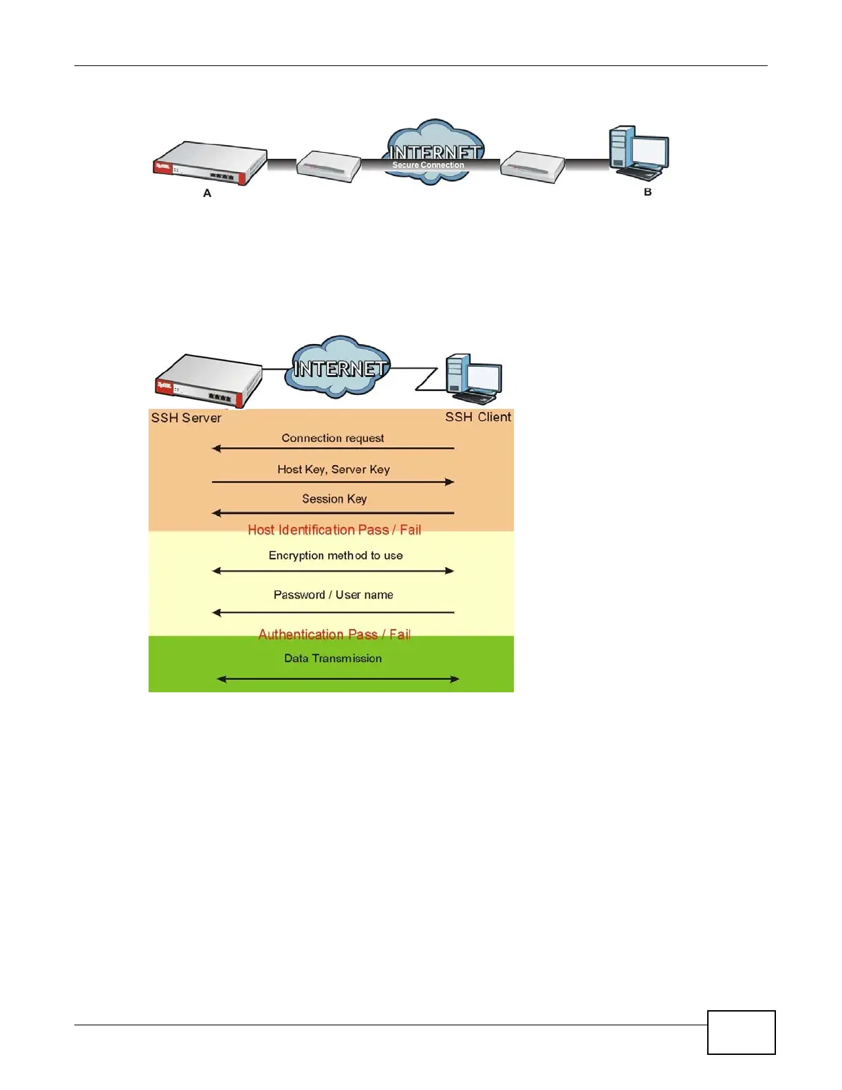 The SSH client sends a connection request to the SSH server. The server identifies itself with a host