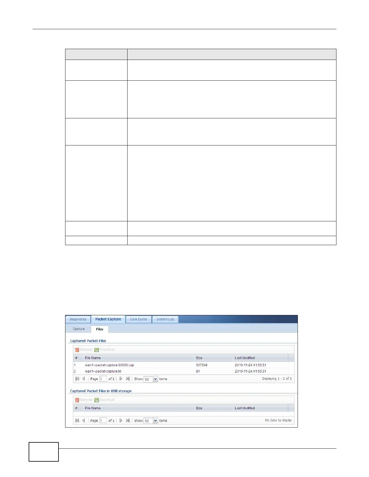 screen. This screen lists the files of packet captures stored on the ZyWALL or a connected USB