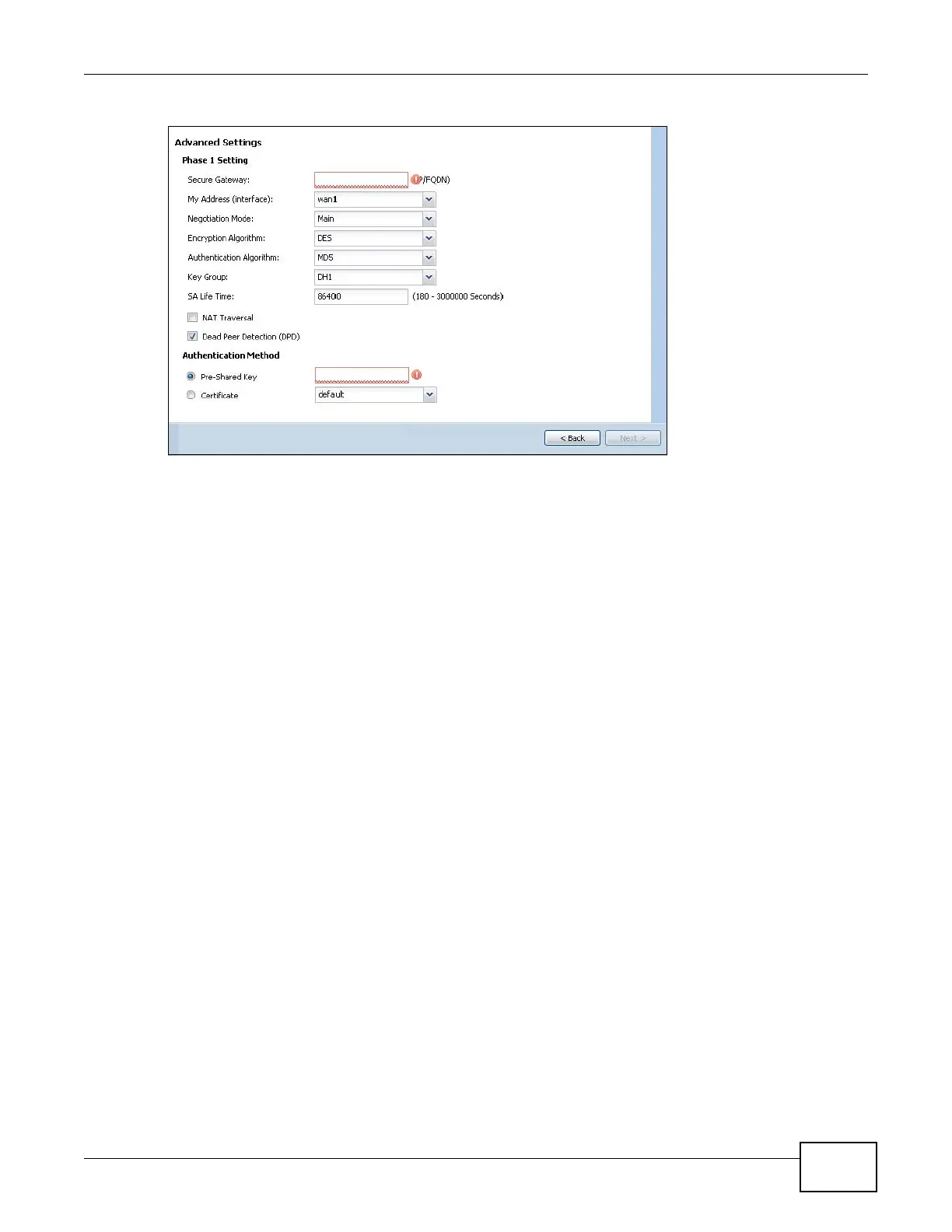 Figure 37 VPN Advanced Wizard: Phase 1 Settings
