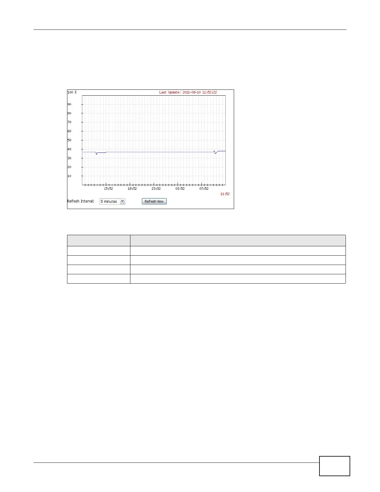 Use this screen to look at a chart of the ZyWALL’s recent memory (RAM) usage. To access this