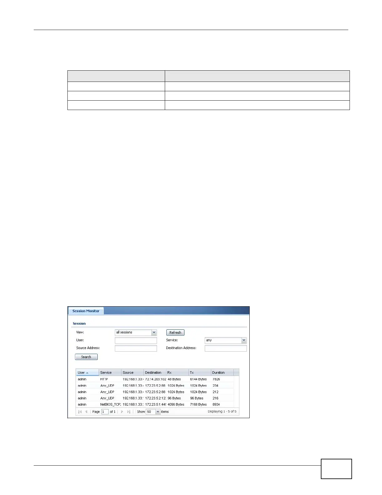 You can look at all established sessions that passed through the ZyWALL by user, service, source IP