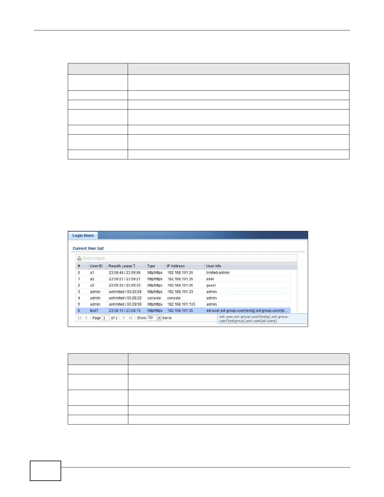 Use this screen to look at a list of the users currently logged into the ZyWALL. To access this screen,