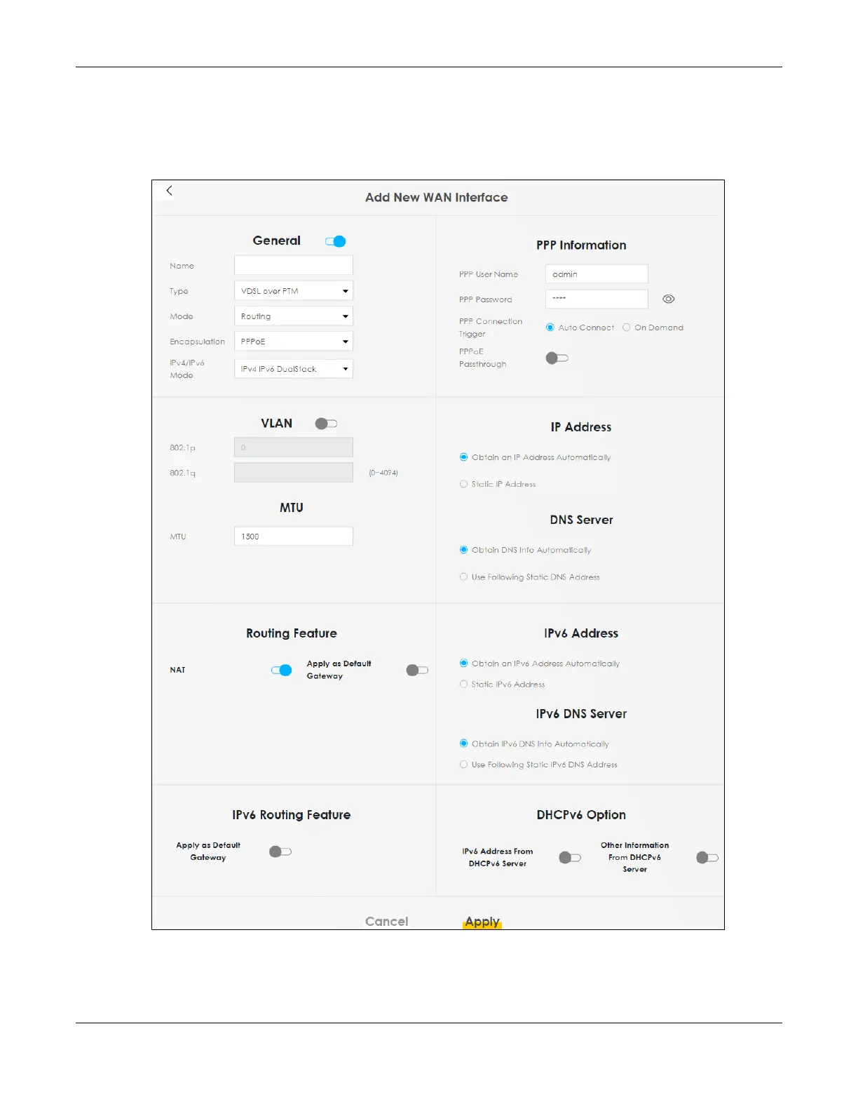 The following example screen displays when you select the VDSL over PTM connection type, Routing