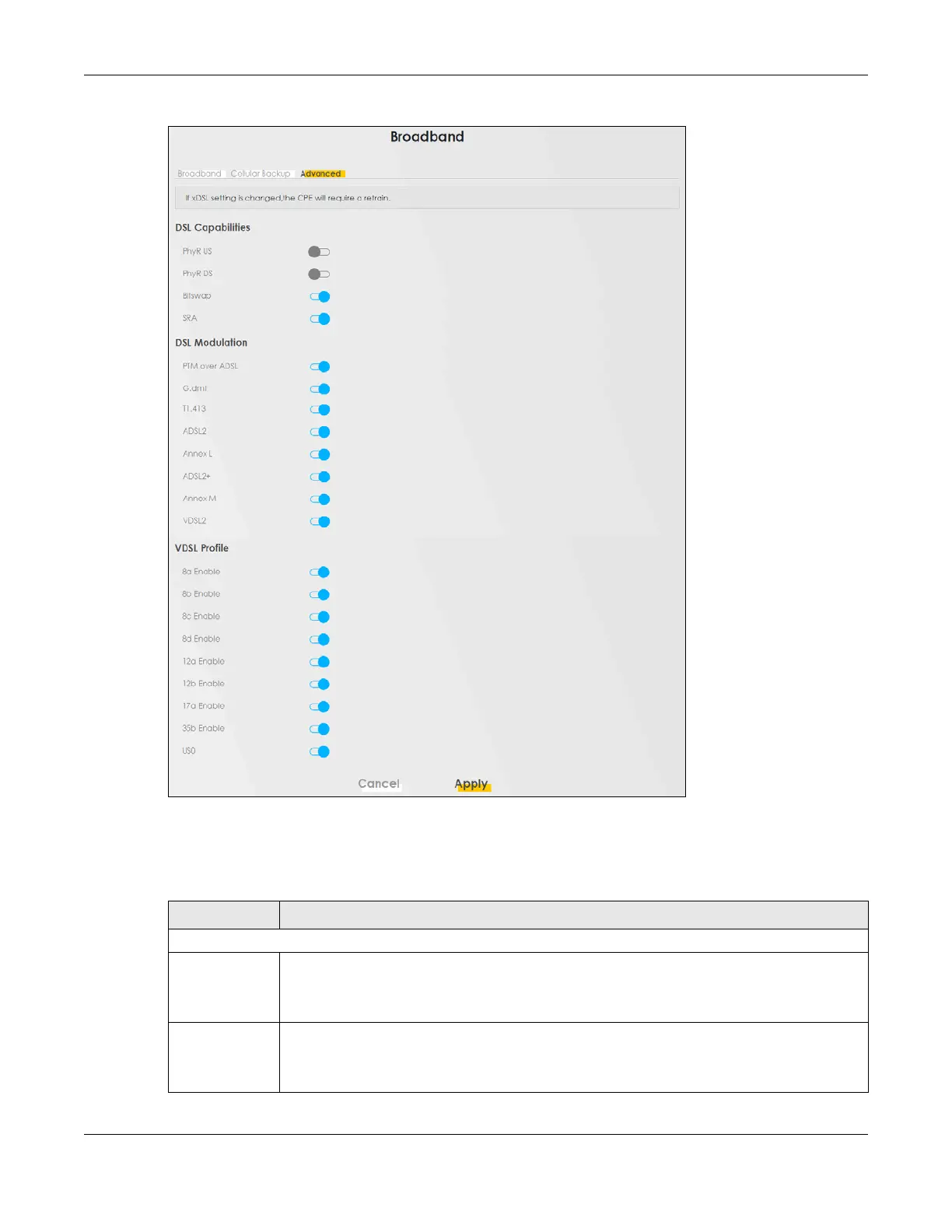 Table 42 Network Setting > Broadband > Advanced