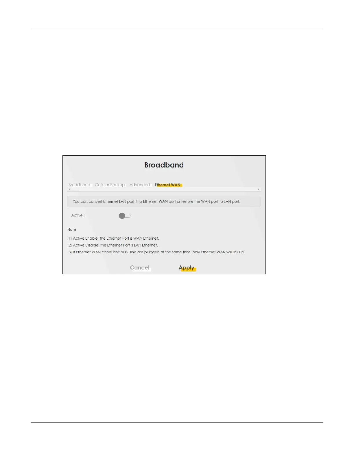 Use this screen to have the fourth LAN port act as an Ethernet WAN port. You can restore it back from a