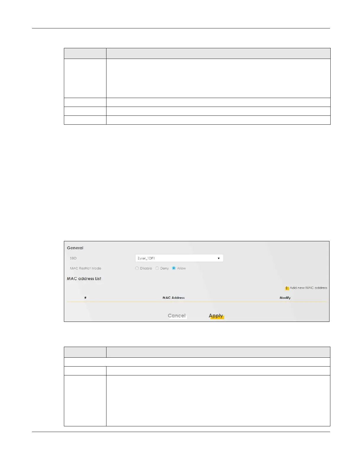 devices from accessing the Zyxel Device (Deny), based on the MAC address of each connected