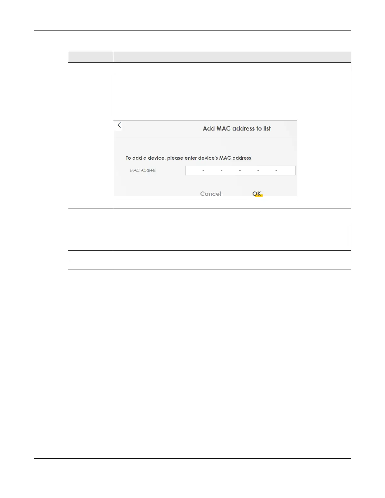 MAC Address This is the MAC addresses of the WiFi devices that are allowed or denied access to the Zyxel