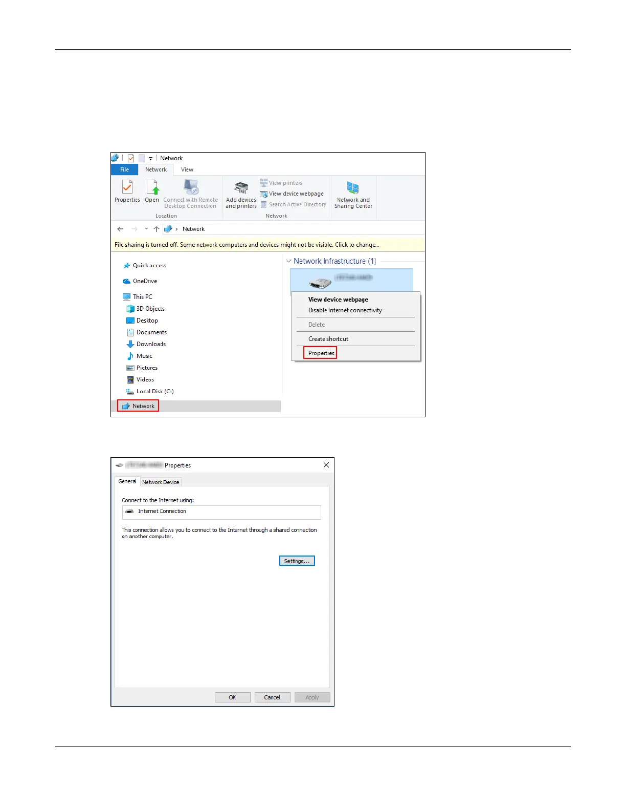 3 In the Internet Connection Properties window, click Settings to see port mappings.