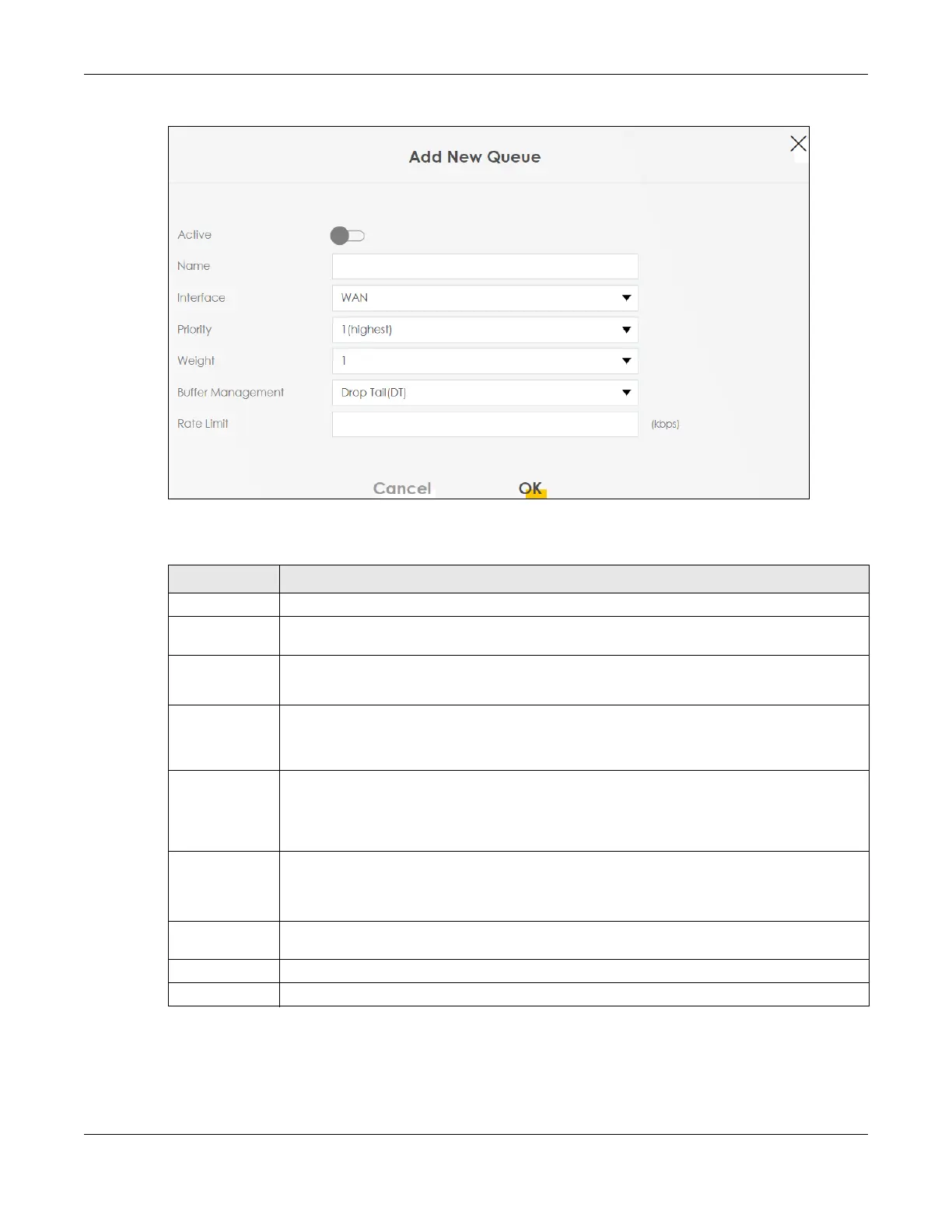 Rate Limit Specify the maximum transmission rate (in Kbps) allowed for traffic on this queue. If you enter 0
