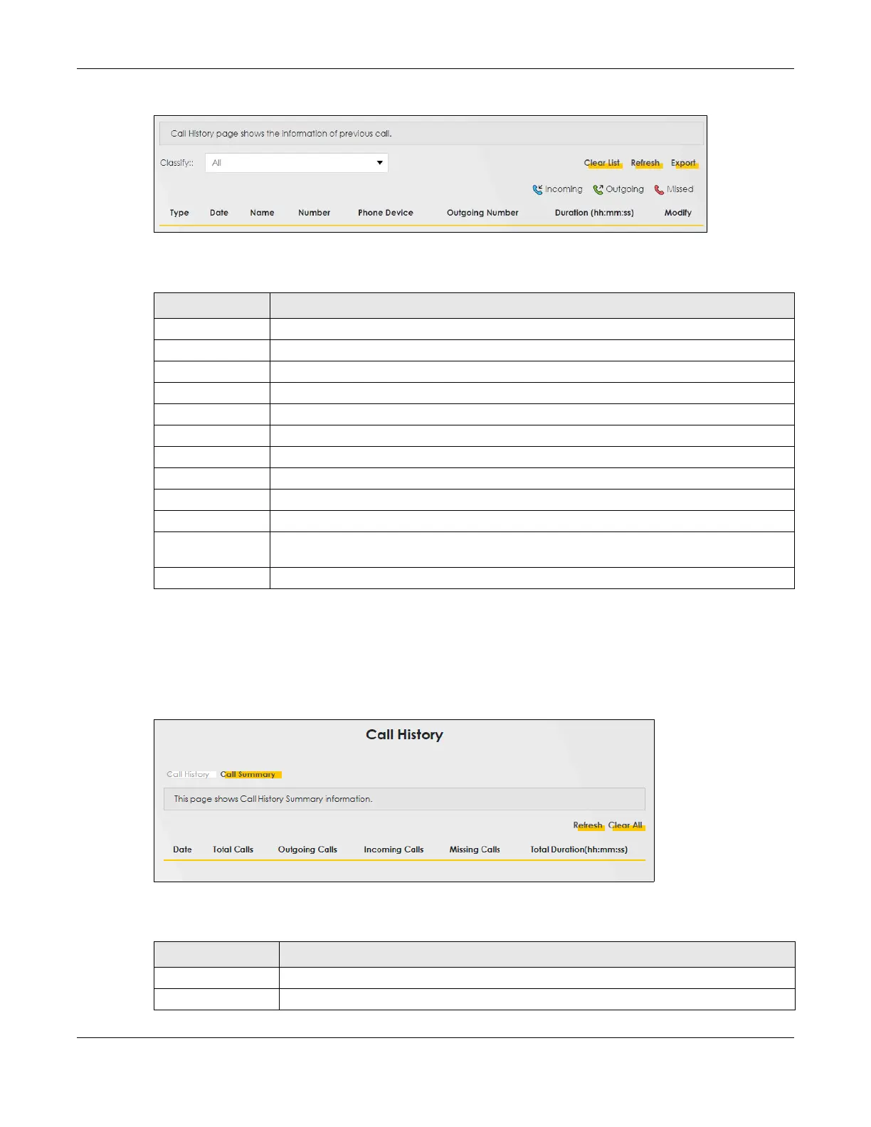 received, dialed and missed calls. To access this screen, click VoIP > Call History > Call Summary.