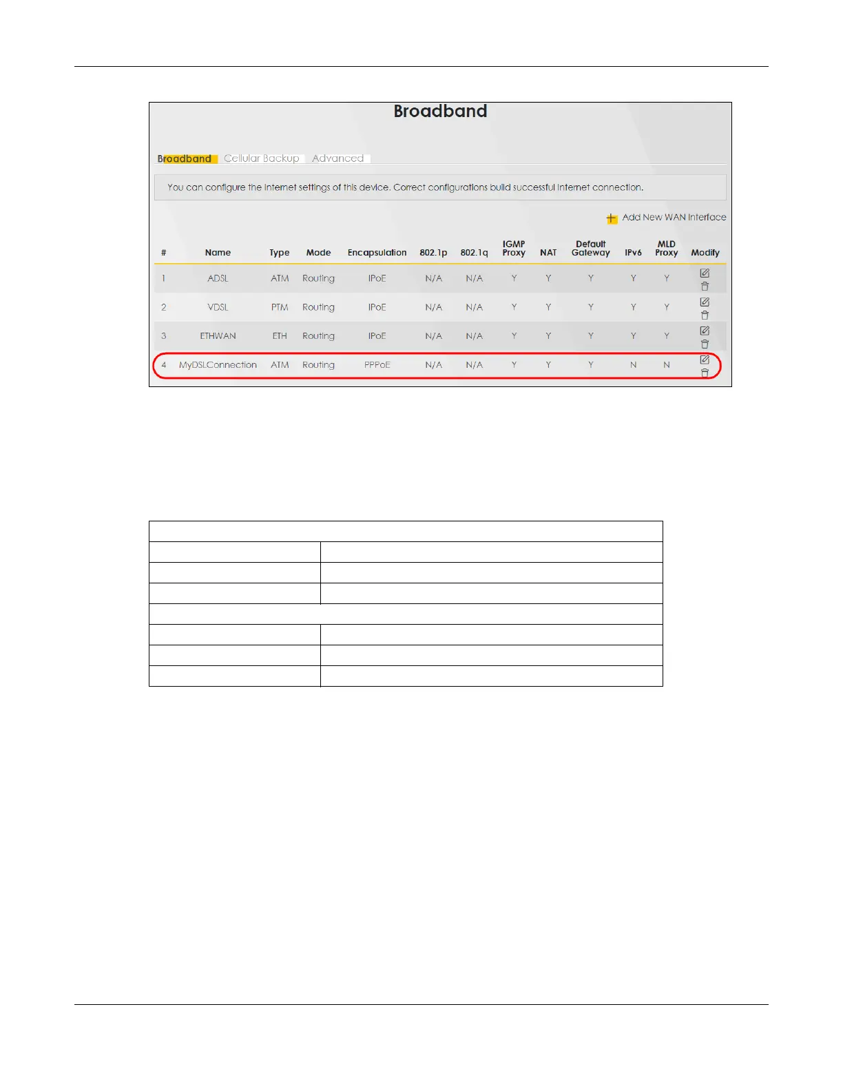 1 In this bridge mode example, the DSL WAN connection has the following information.