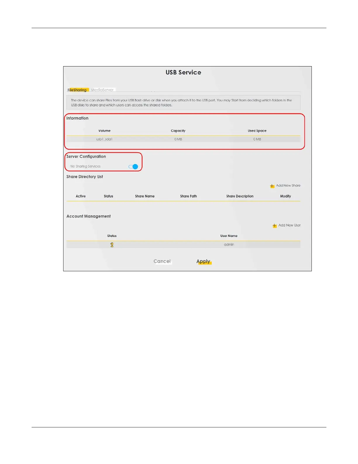 Apply to activate the file sharing function. The Zyxel Device automatically adds your USB device to the
