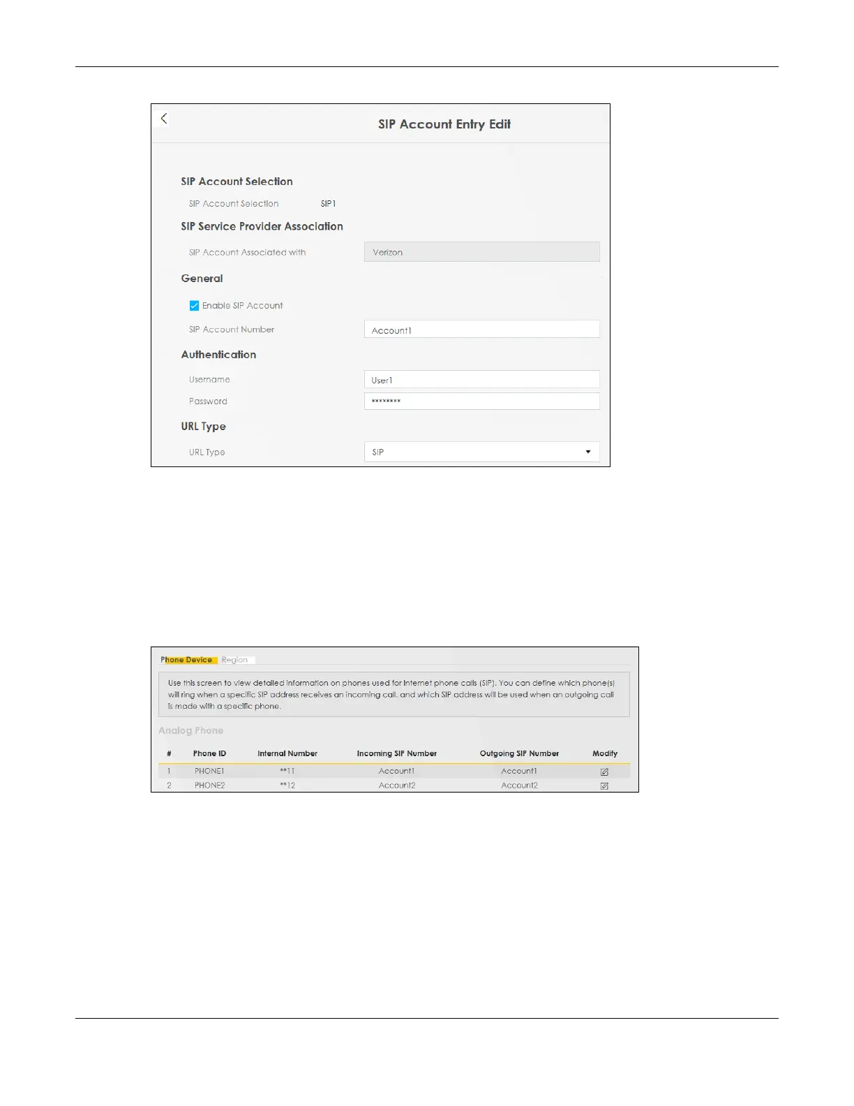 2 Click the Modify icon of PHONE1 to configure PHONE1 on your Zyxel Device. The following screen