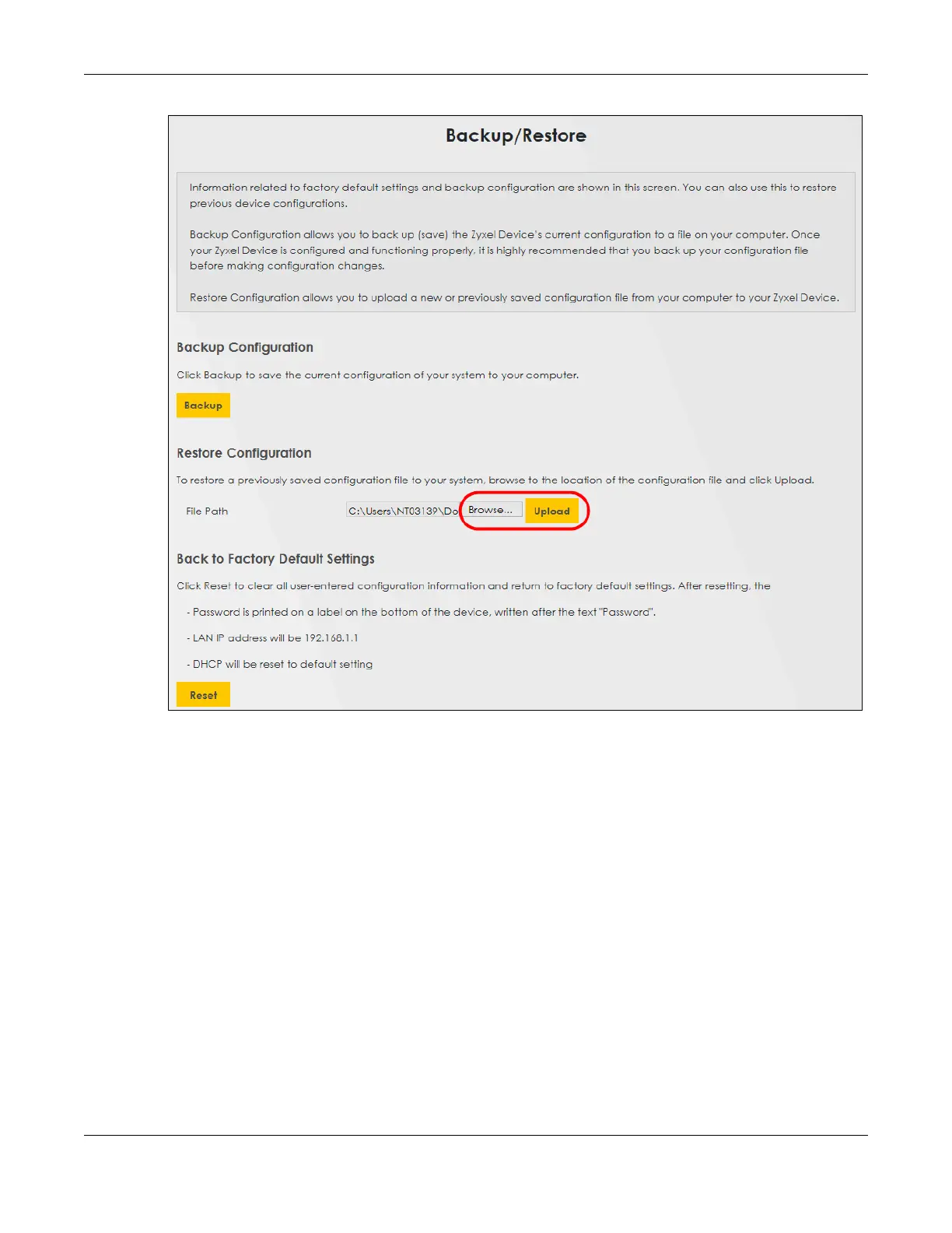 3 The Zyxel Device automatically restarts after the configuration file is successfully uploaded. Wait for one