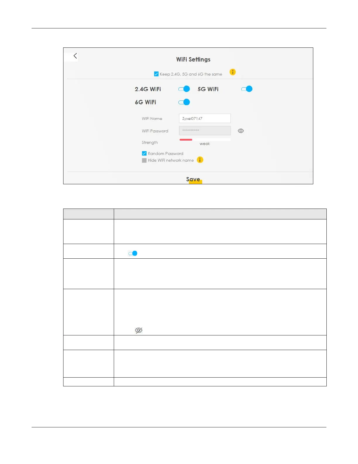 WiFi Password If you selected Random Password, this field displays a pre-shared key generated by the Zyxel