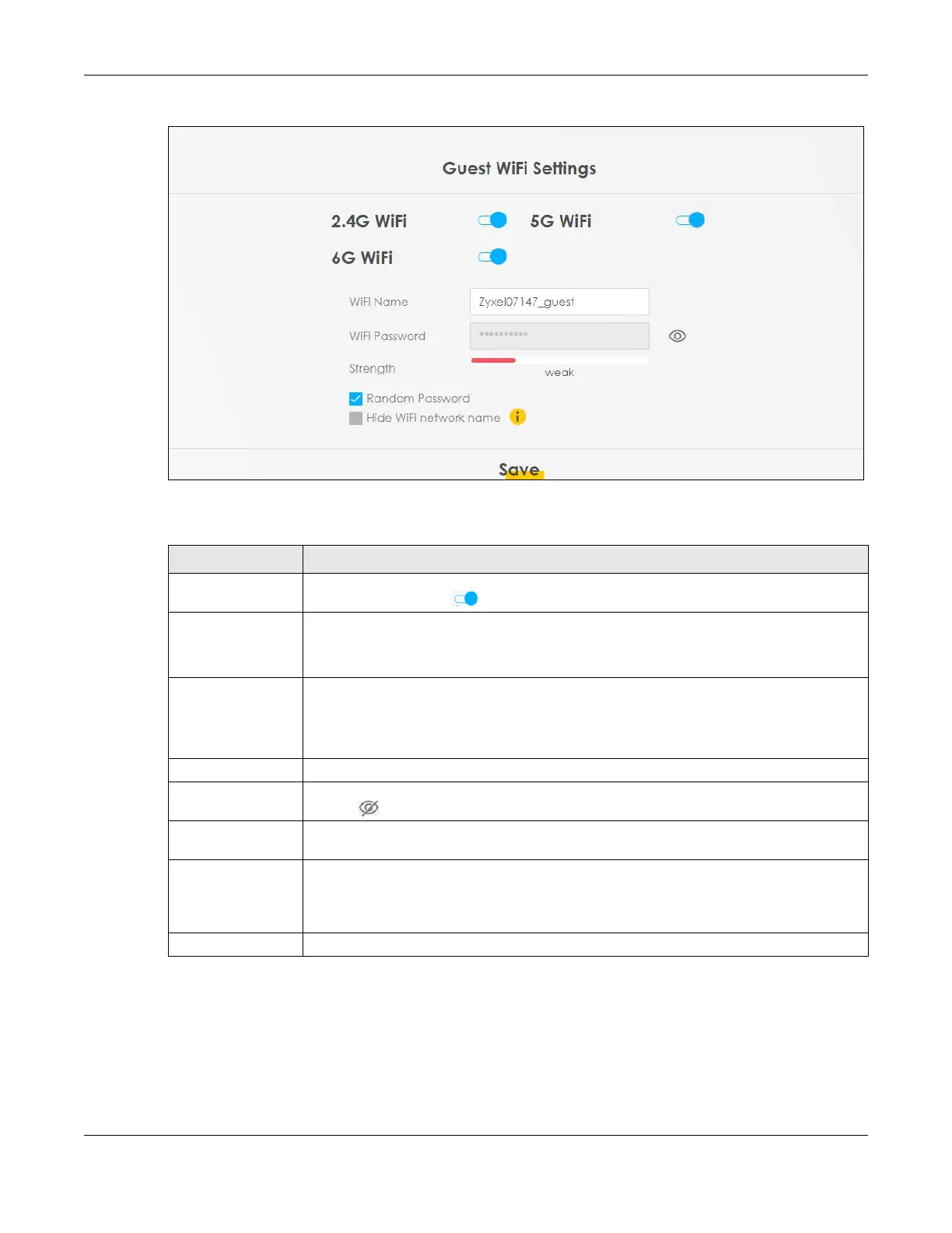 2.4G/5G/6G WiFi Click this switch to enable or disable the 2.4 GHz / 5 GHz / 6GHz WiFi networks. When the