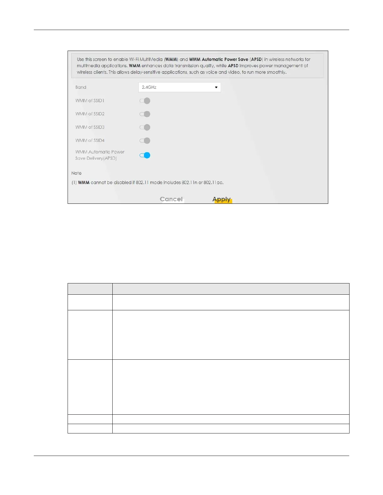 Note: WMM cannot be disabled if 802.11 mode includes 802.11n or 802.11ac.