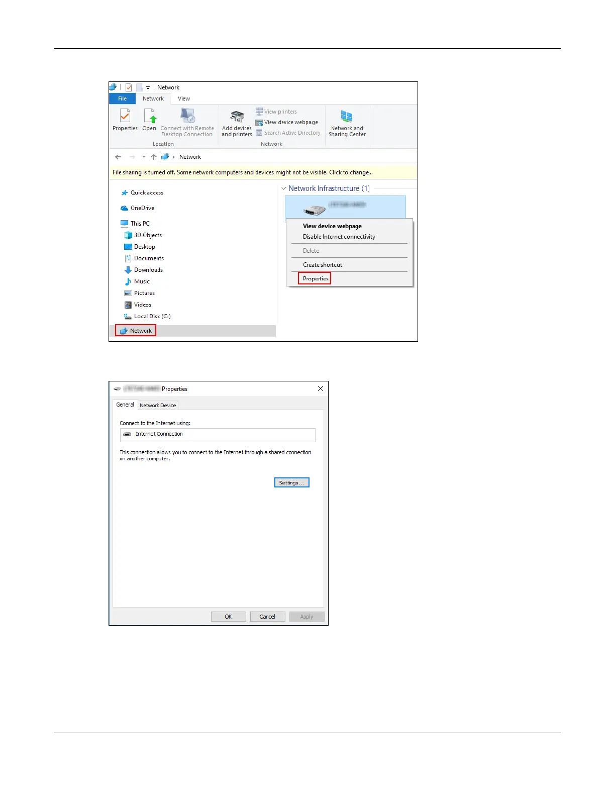 3 In the Internet Connection Properties window, click Settings to see port mappings.