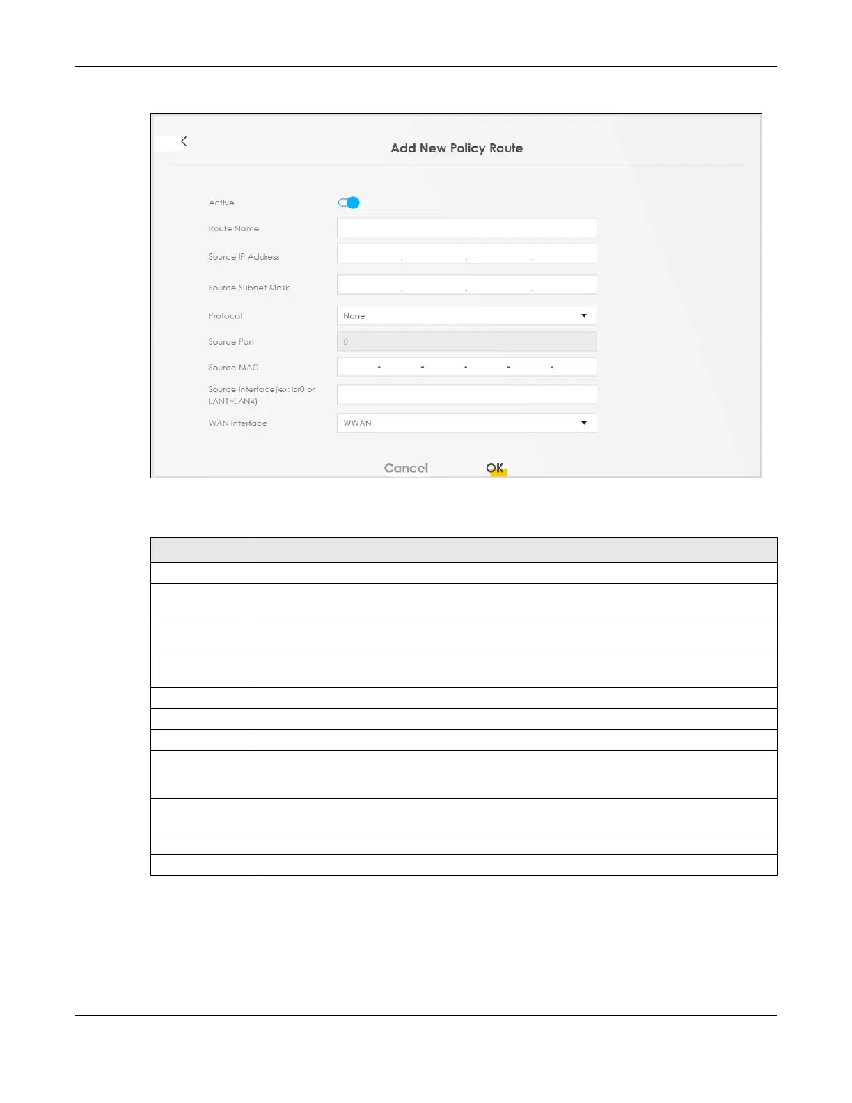 Active Click this switch to activate this policy route. Otherwise, click to disable.