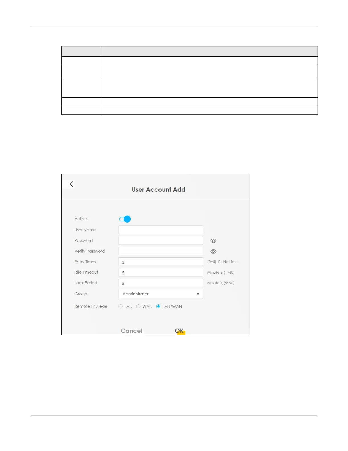 This field displays whether this user can access the Zyxel Device with HTTP, Telnet or SSH through