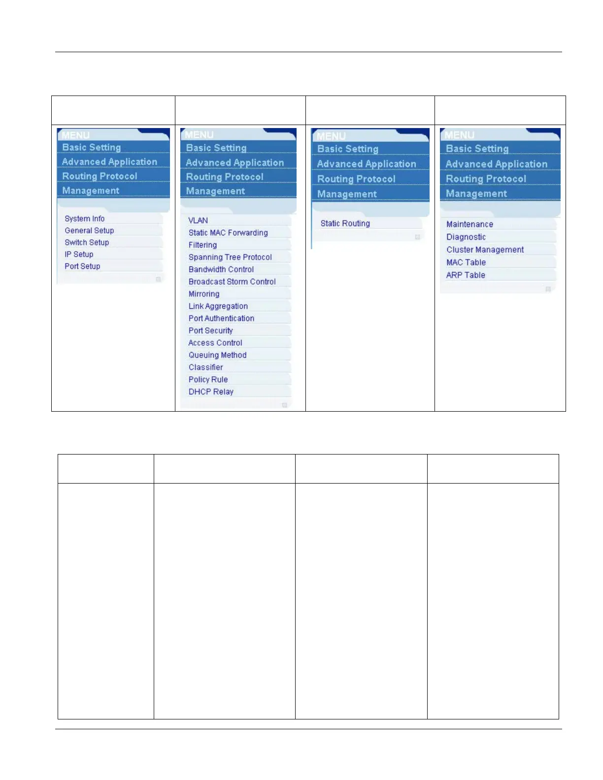 The following table lists the various web configurator screens within the sub-links.