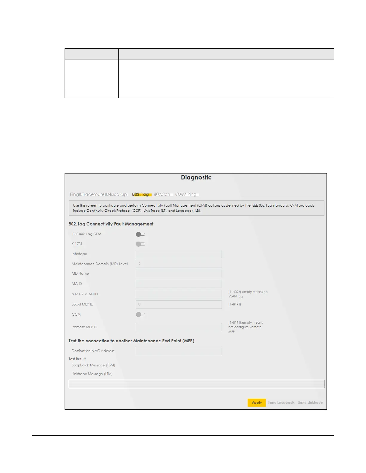 Click Maintenance > Diagnostic > 802.1ag to open the following screen. Use this screen to configure