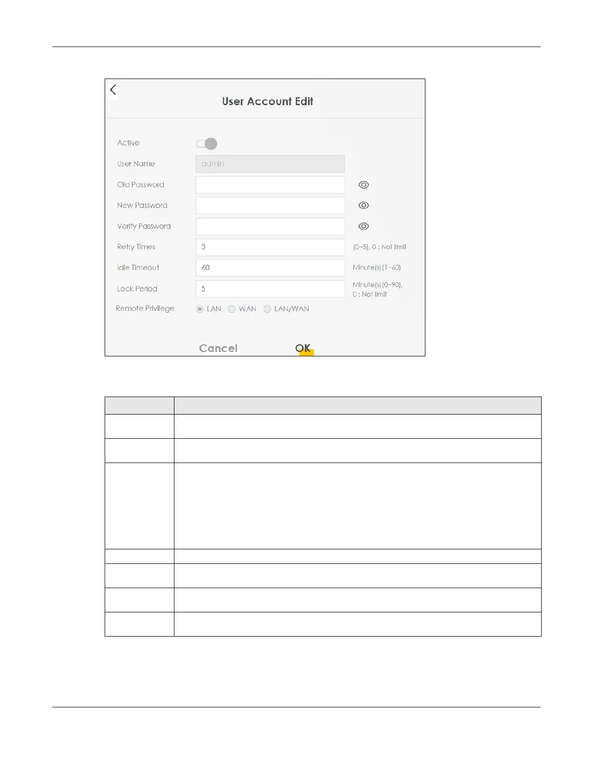 Idle Timeout Enter the length of inactive time before the Zyxel Device will automatically log the user out of the