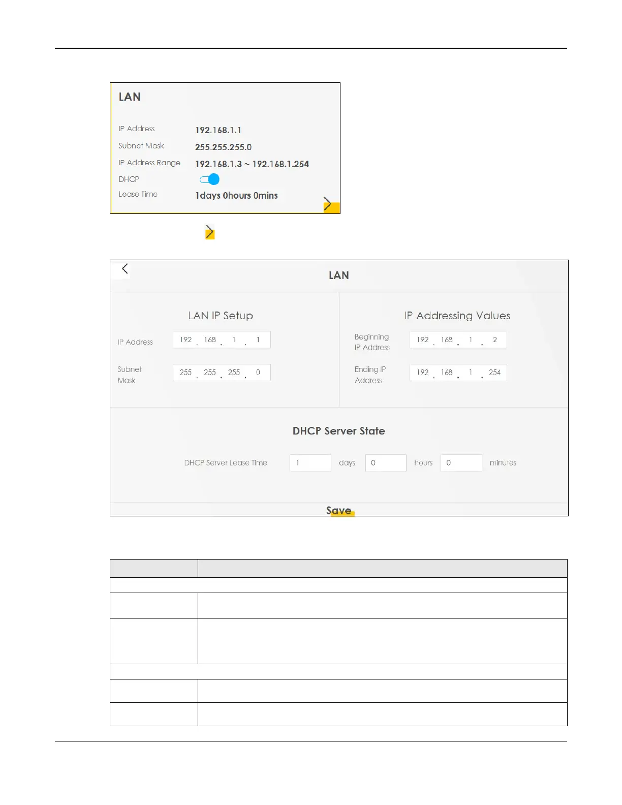 Click the Arrow icon ( ) to configure the LAN IP settings and DHCP setting for your Zyxel Device.