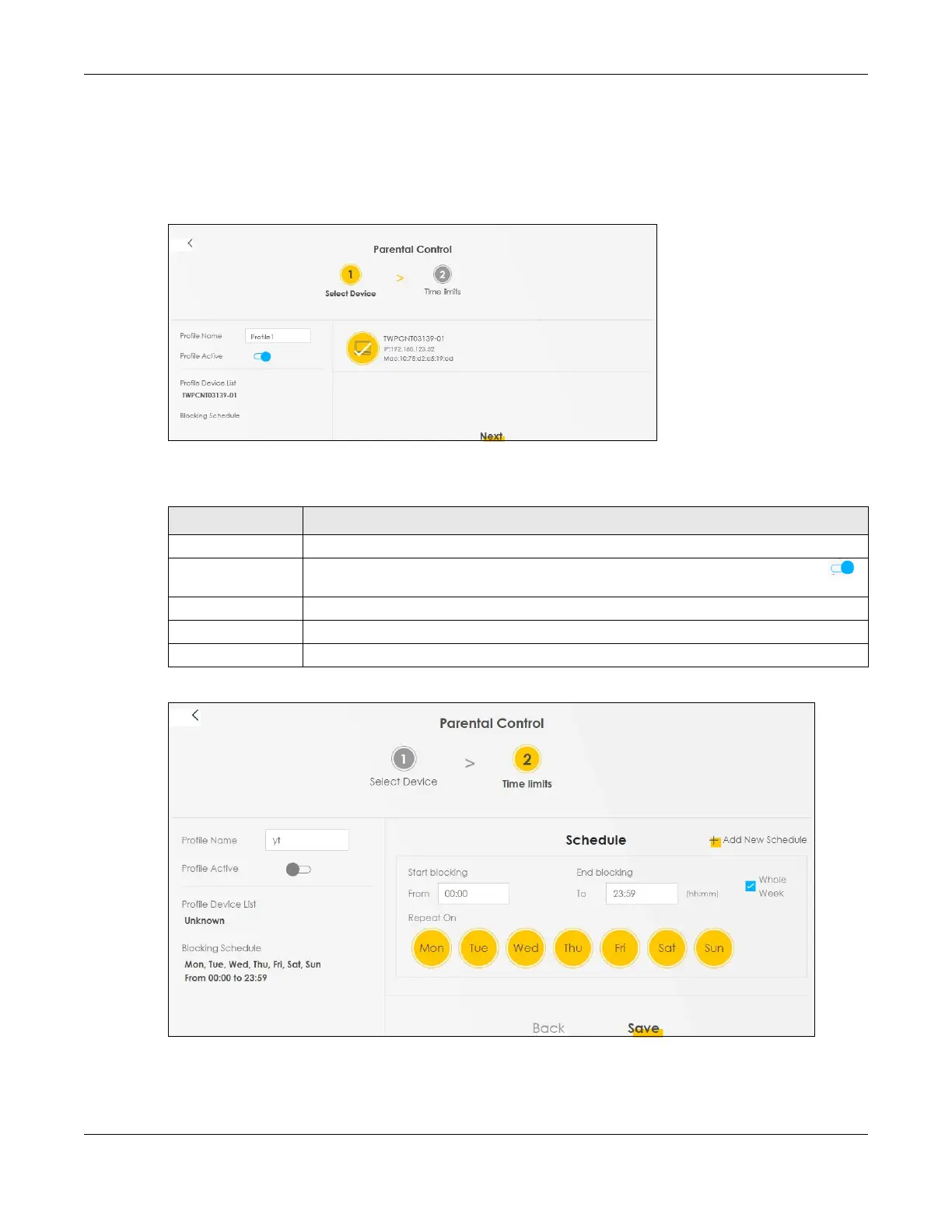 Blocking Schedule This field shows the time during which Internet access is blocked on the profile device(s).