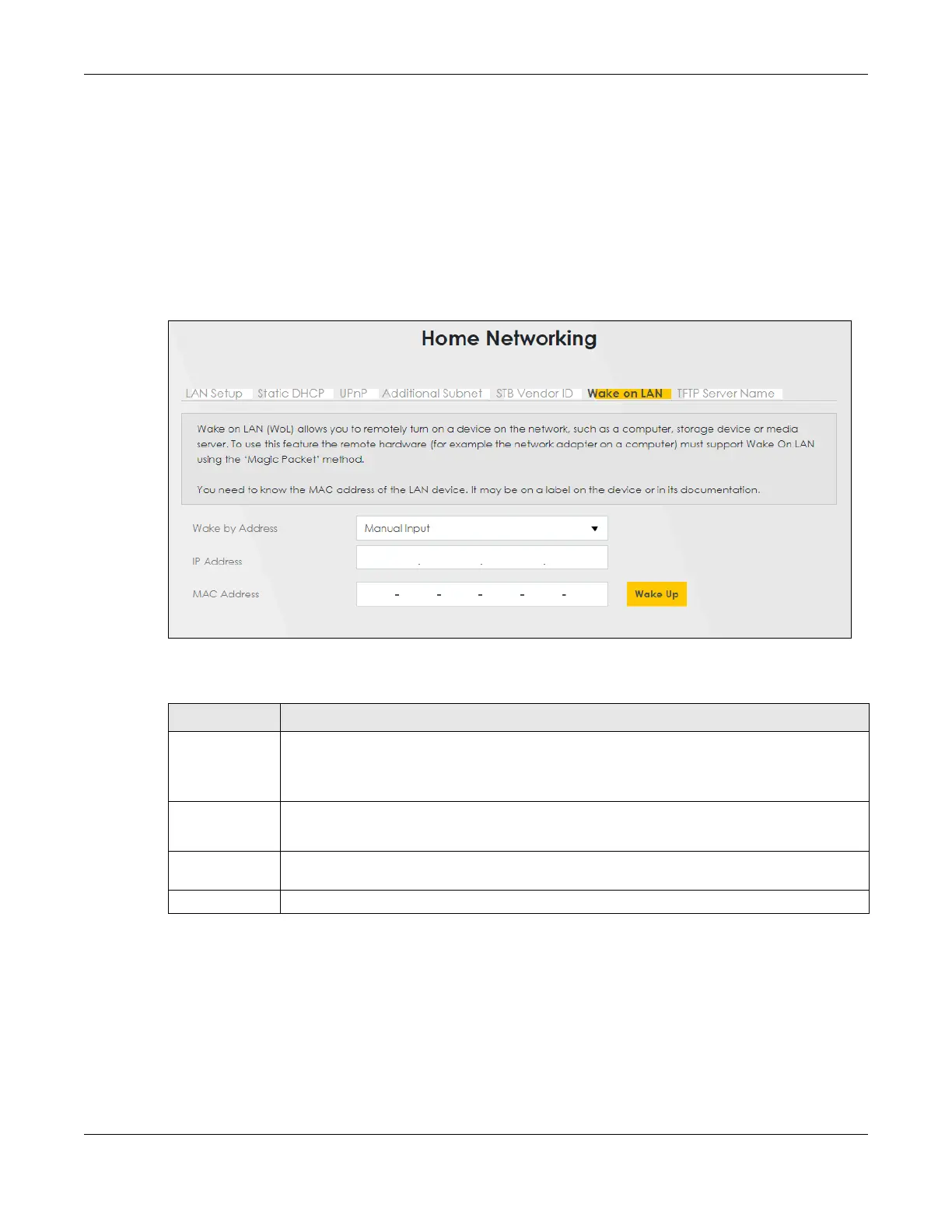 Table 75 Network Setting > Home Networking > Wake on LAN
