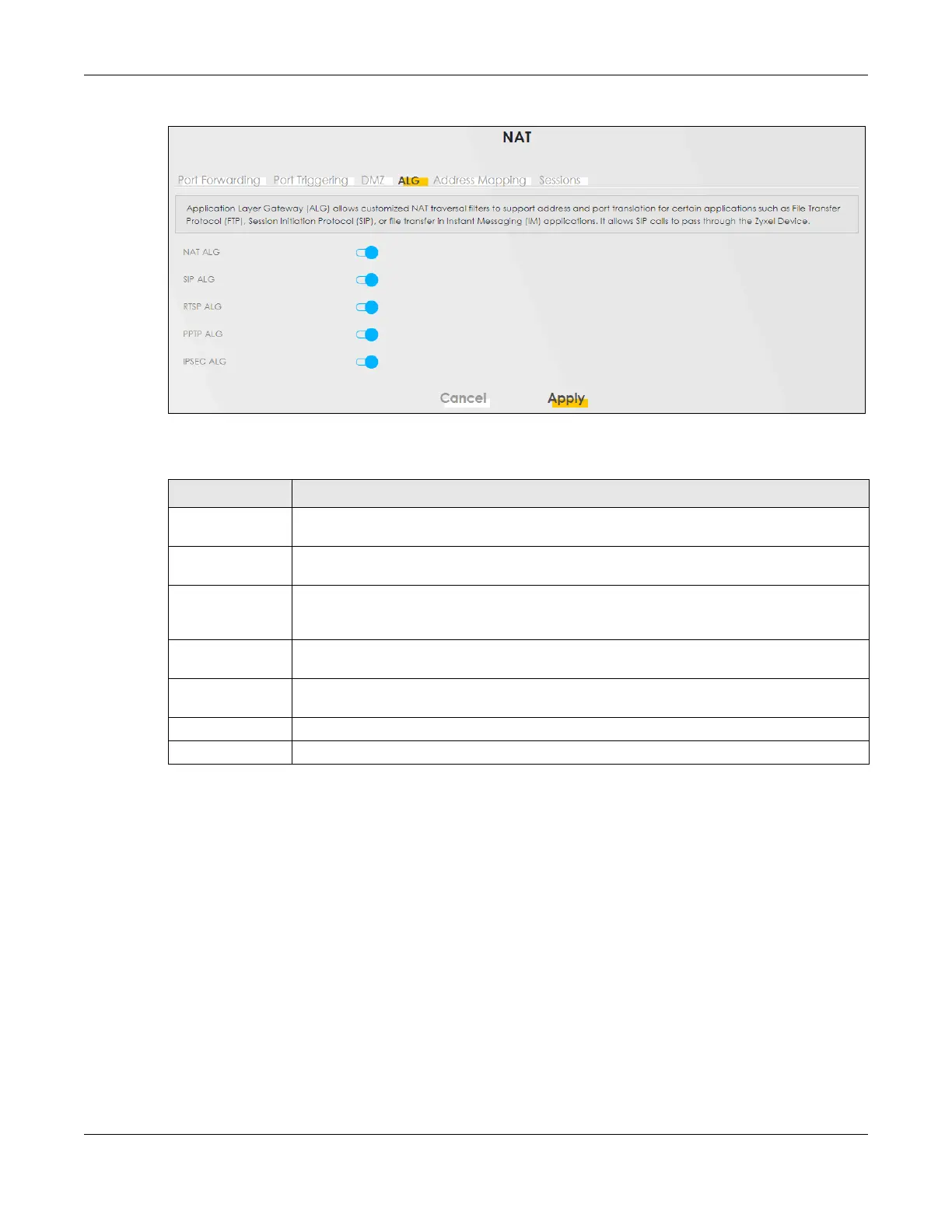 NAT ALG Enable this to make sure applications such as FTP and file transfer in IM applications work