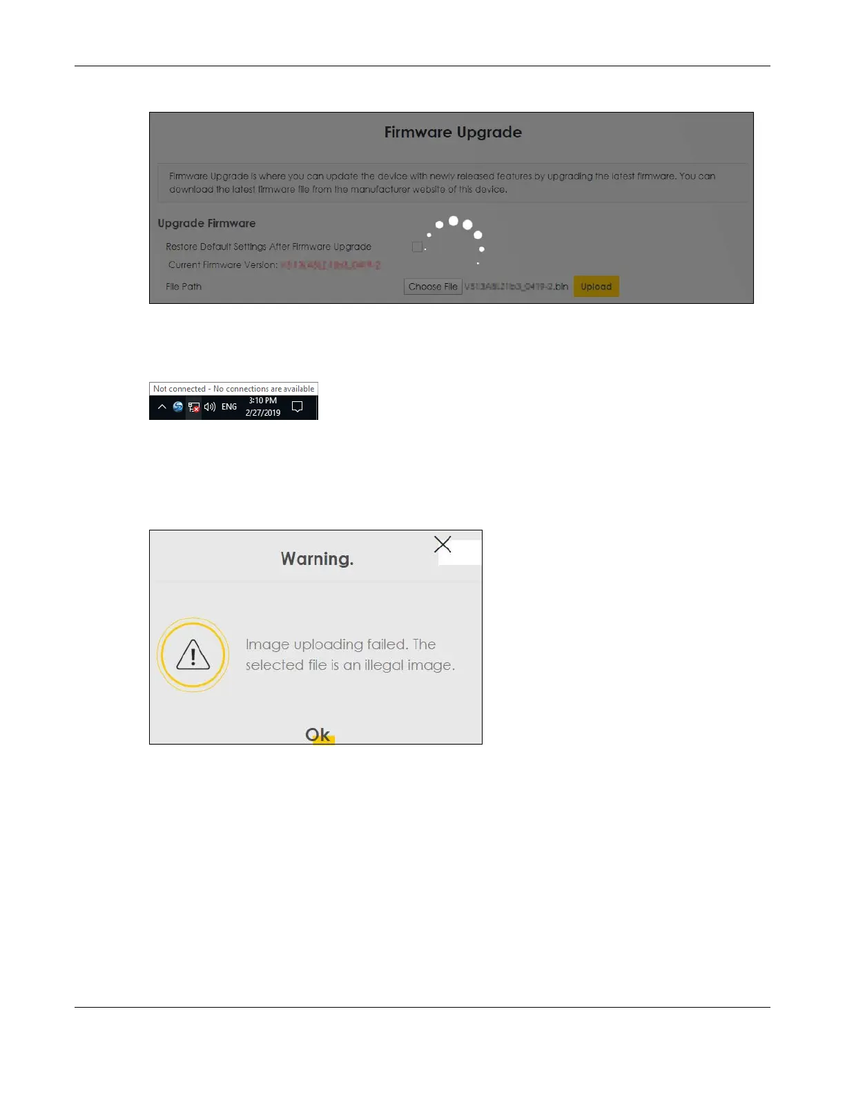 If the upload was not successful, an error screen will appear. Click OK to go back to the Firmware