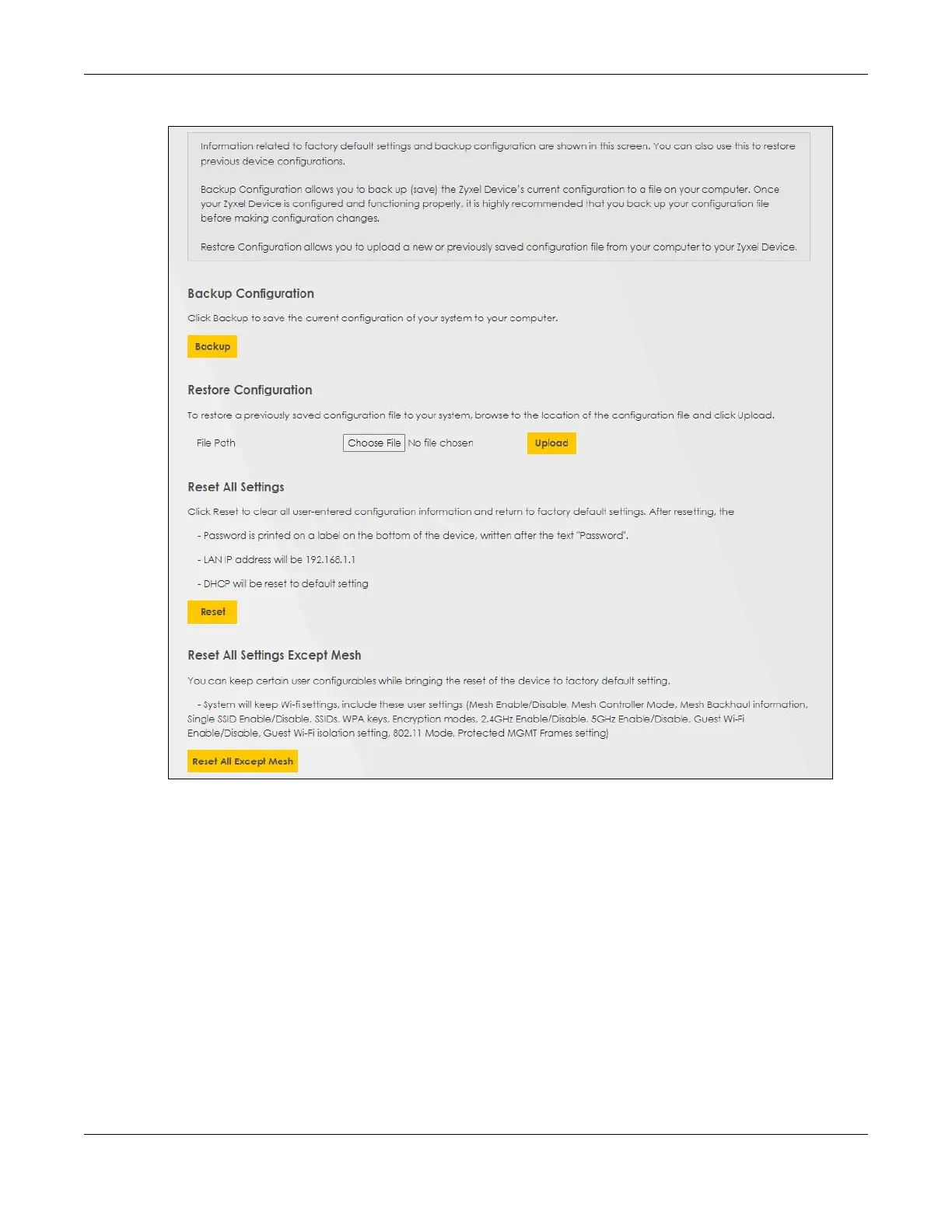 Backup Configuration allows you to back up (save) the Zyxel Device’s current configuration to a file on