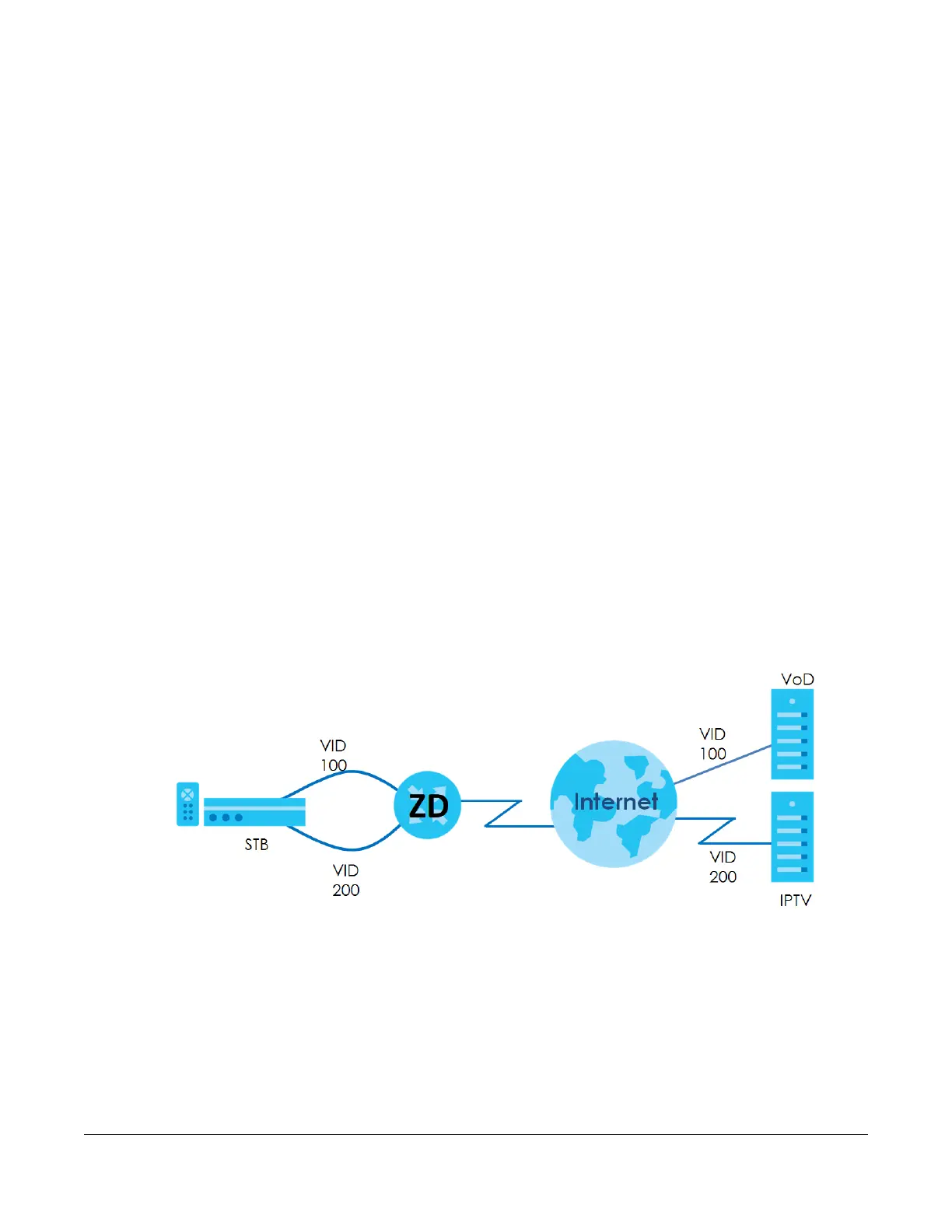 traffic respectively coming from the VoD and IPTV multicast servers. The Zyxel Device can also tag