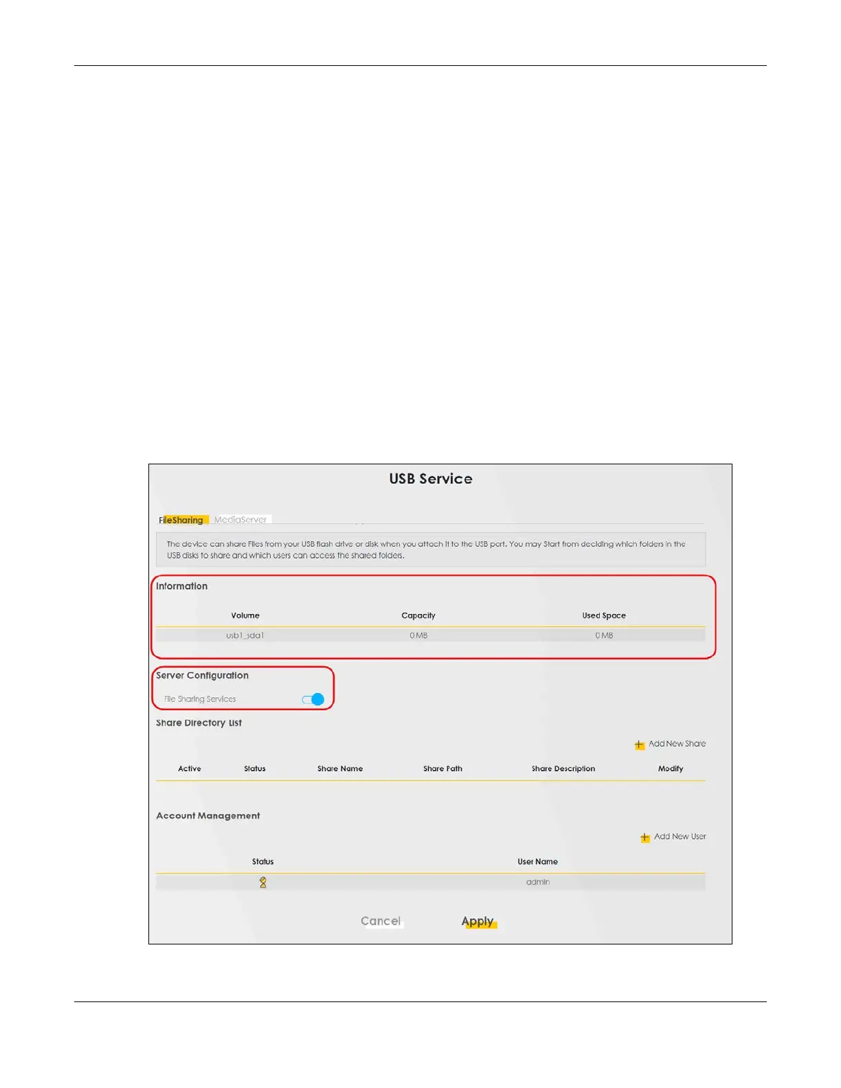 Apply to activate the file sharing function. The Zyxel Device automatically adds your USB device to the