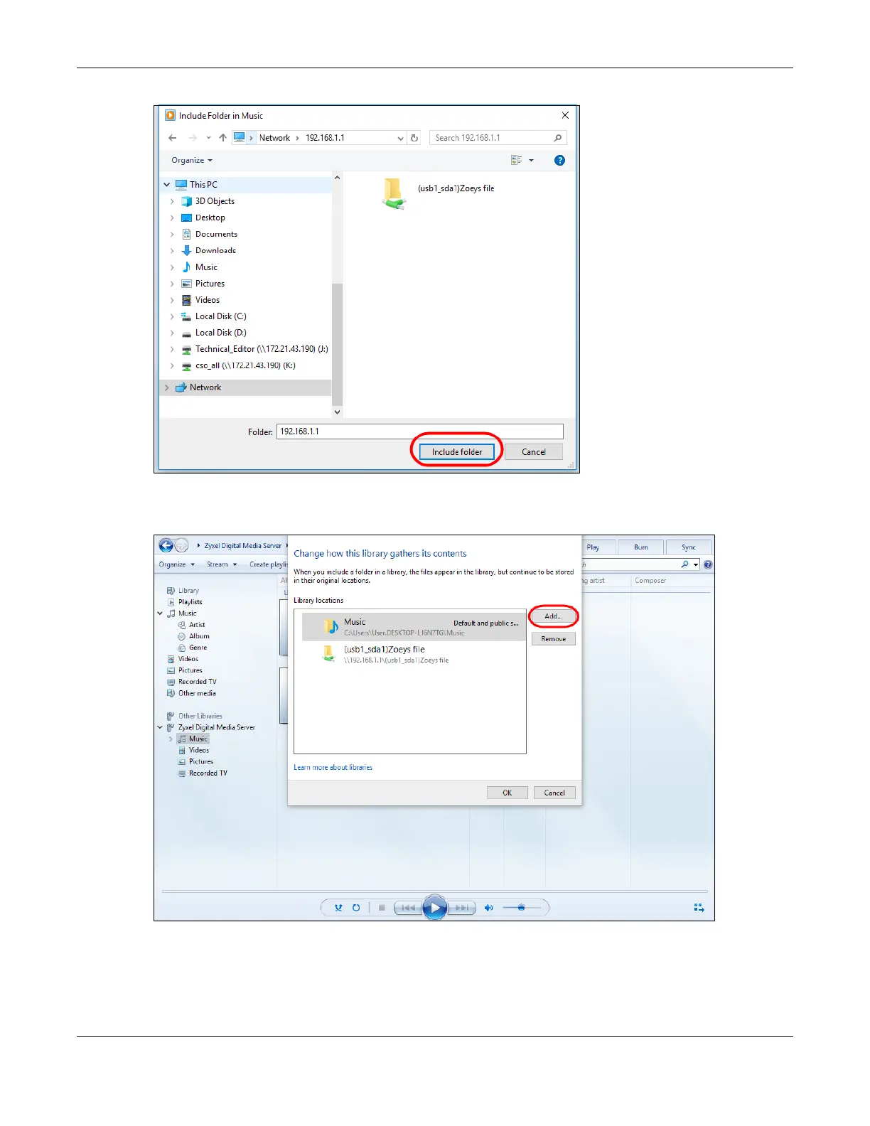 3 Select the shared folder, and then click Add to add it to your Media Library. Click OK to save the