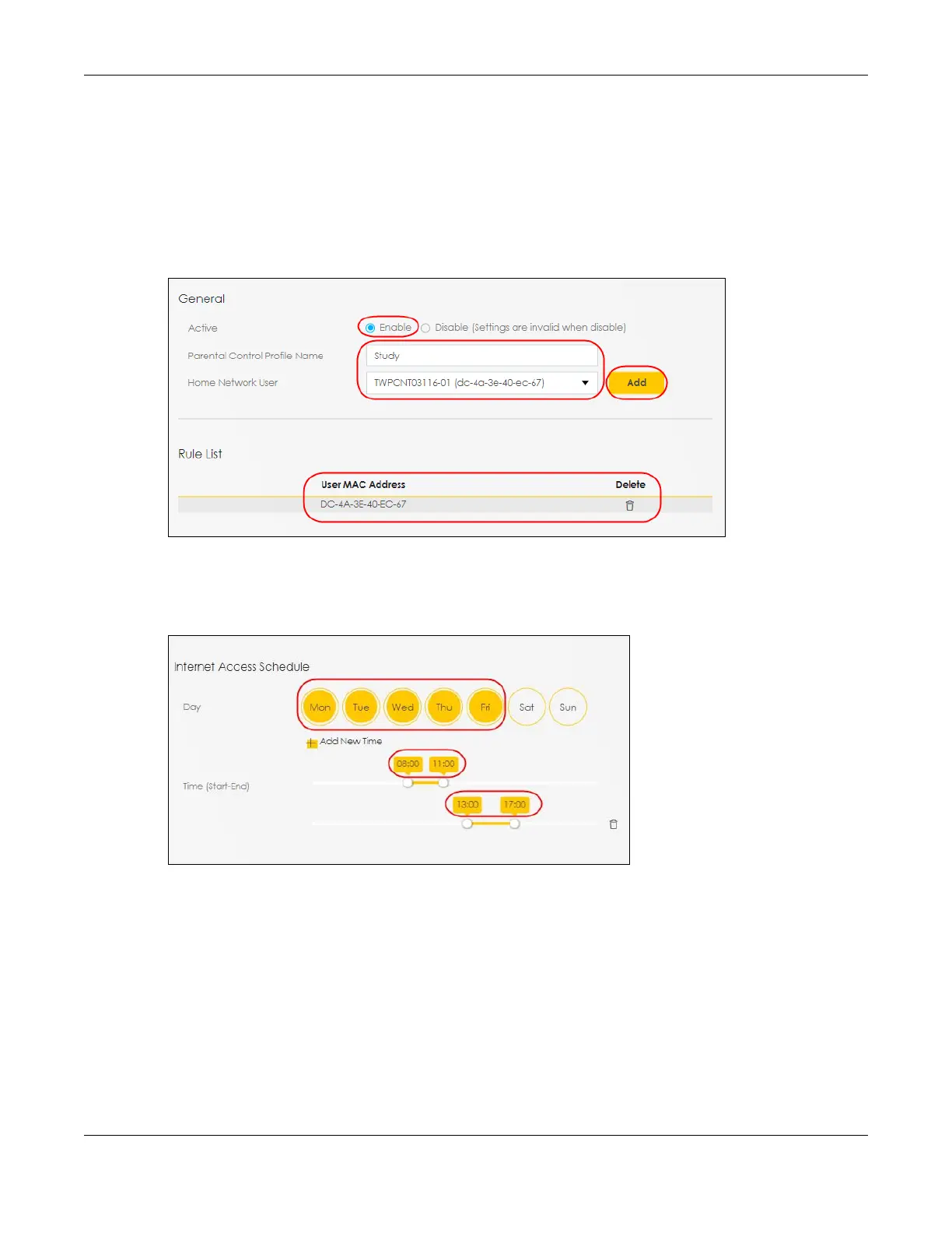 • Select an user this rule applies to in Home Network User, then click Add. You will see the MAC address