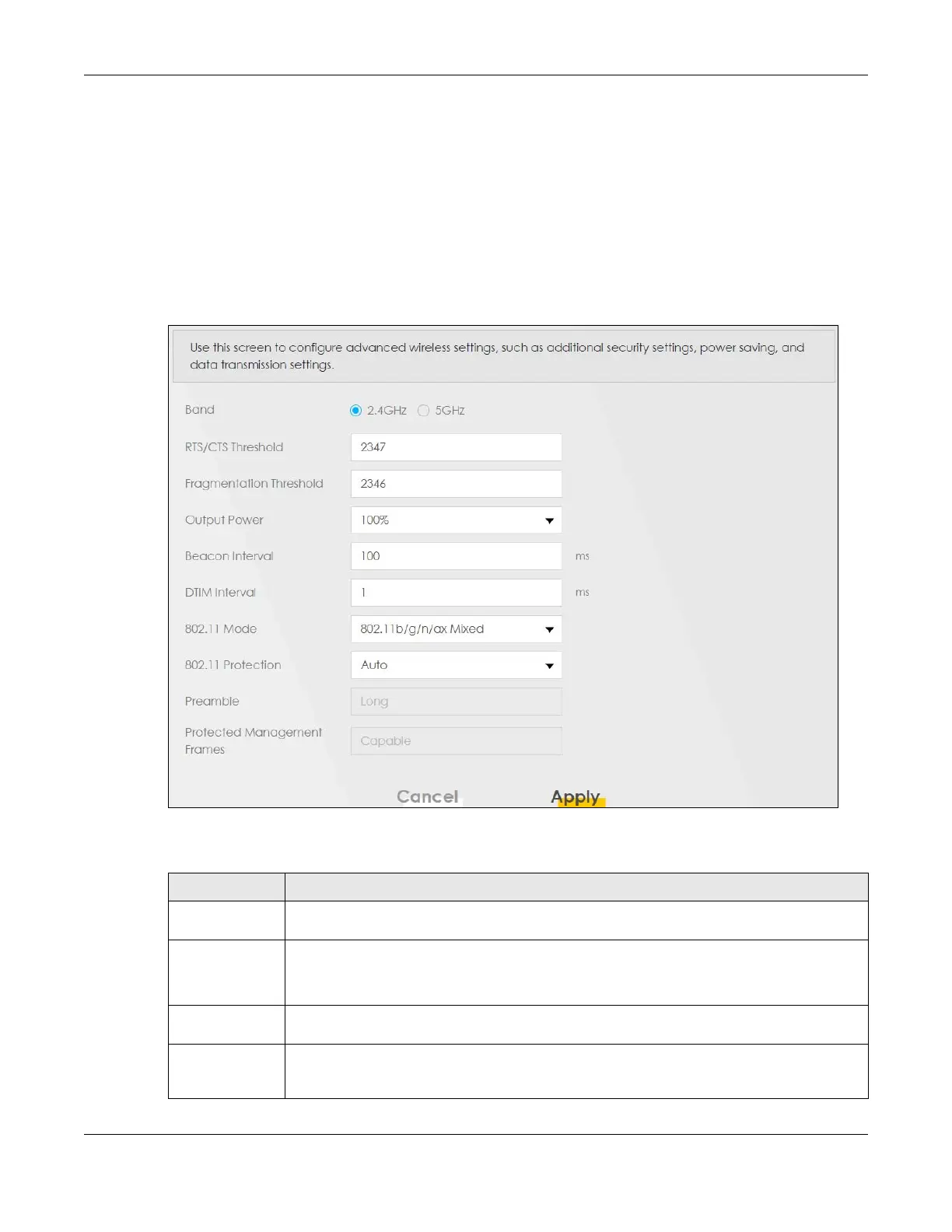 Output Power Set the output power of the Zyxel Device. If there is a high density of APs in an area, decrease