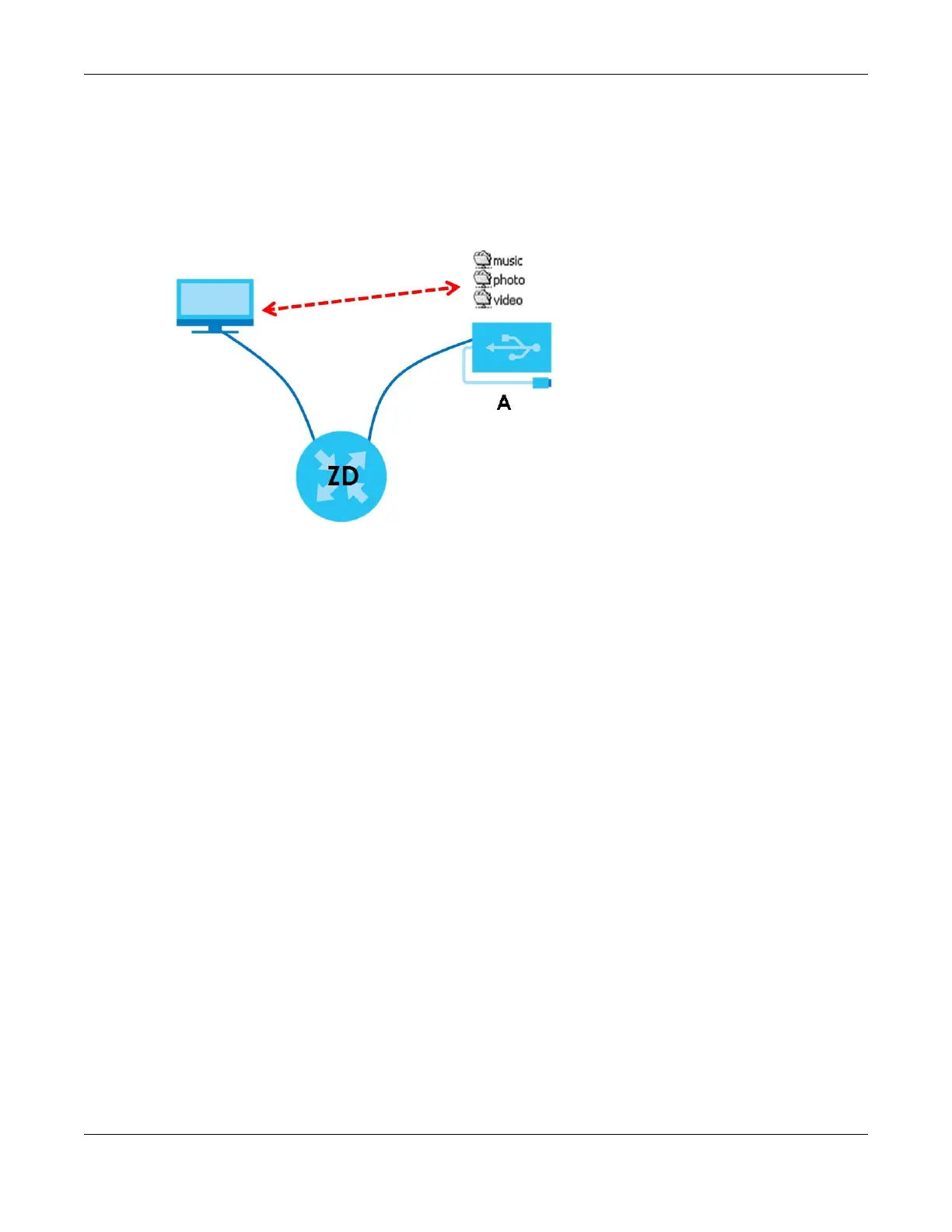 and photos from a USB device (A) connected to the Zyxel Device’s USB port (without having to copy