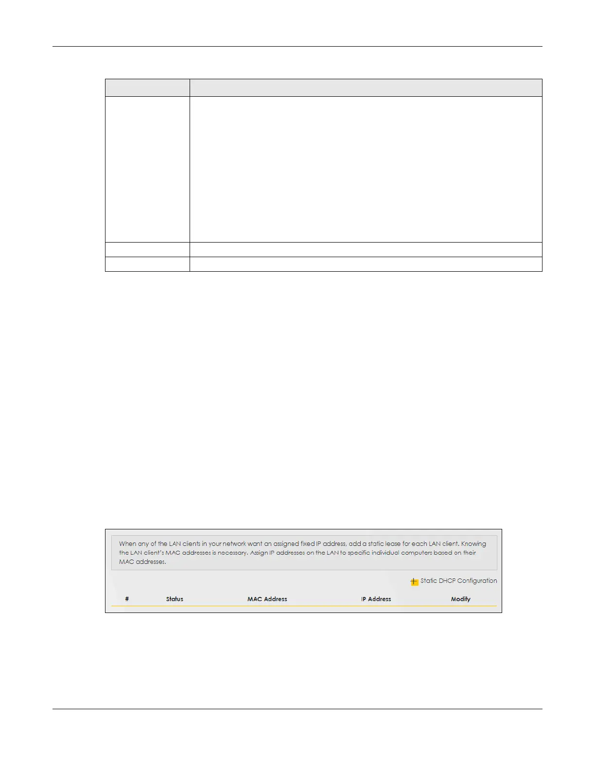 each LAN client. Knowing the LAN client’s MAC addresses is necessary. This table allows you to assign IP